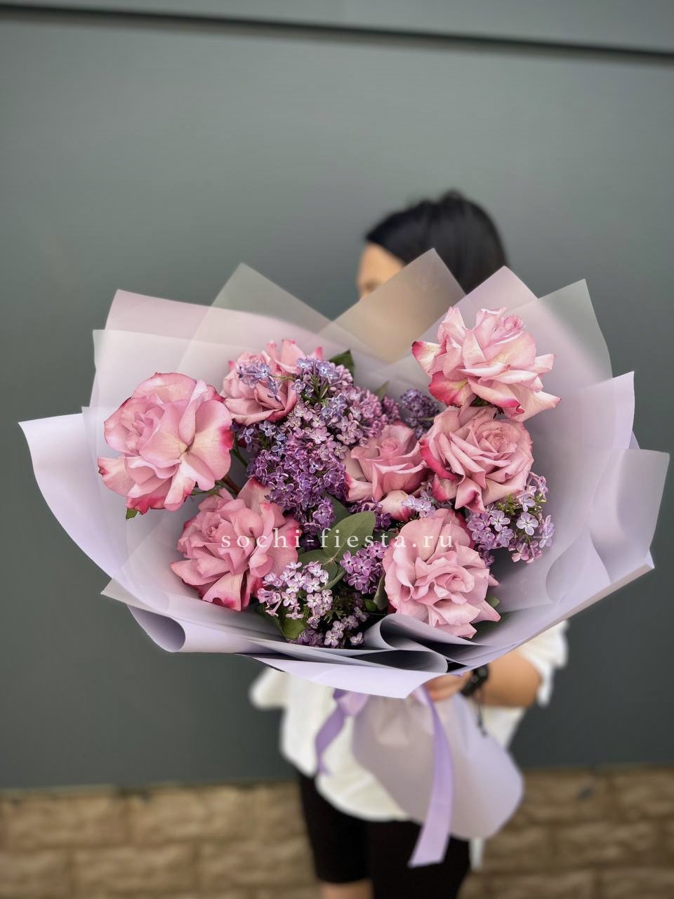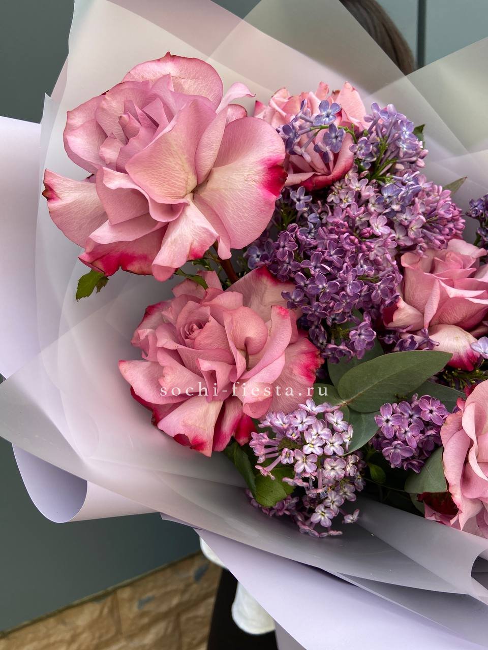 Букет из розовых роз и сирени