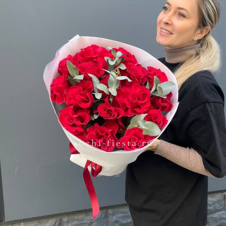 25 красных роз с эвкалиптом