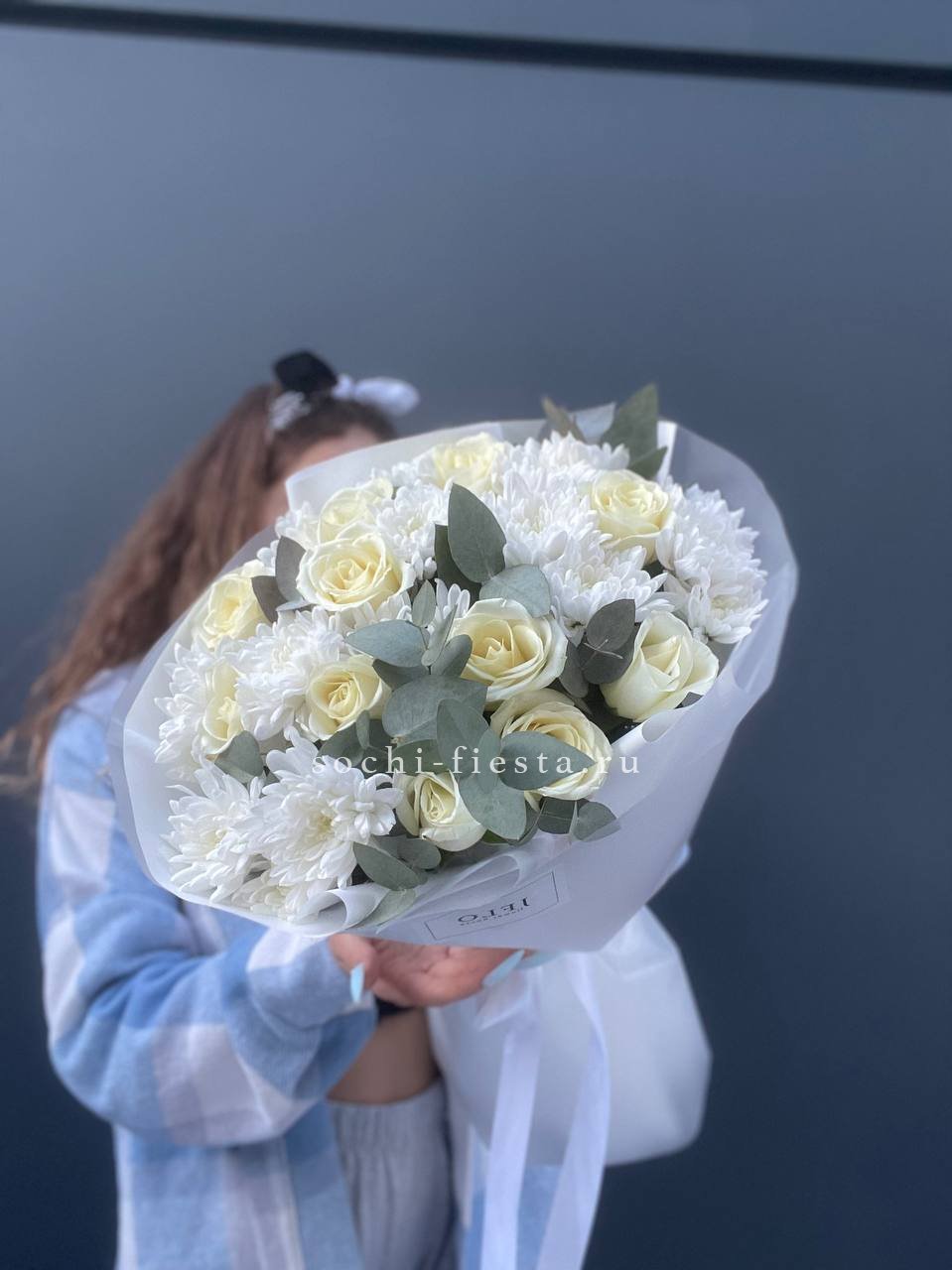Состав: хризантема кустовая, белые розы, эвкалипт, лента, дизайнерская пленка.