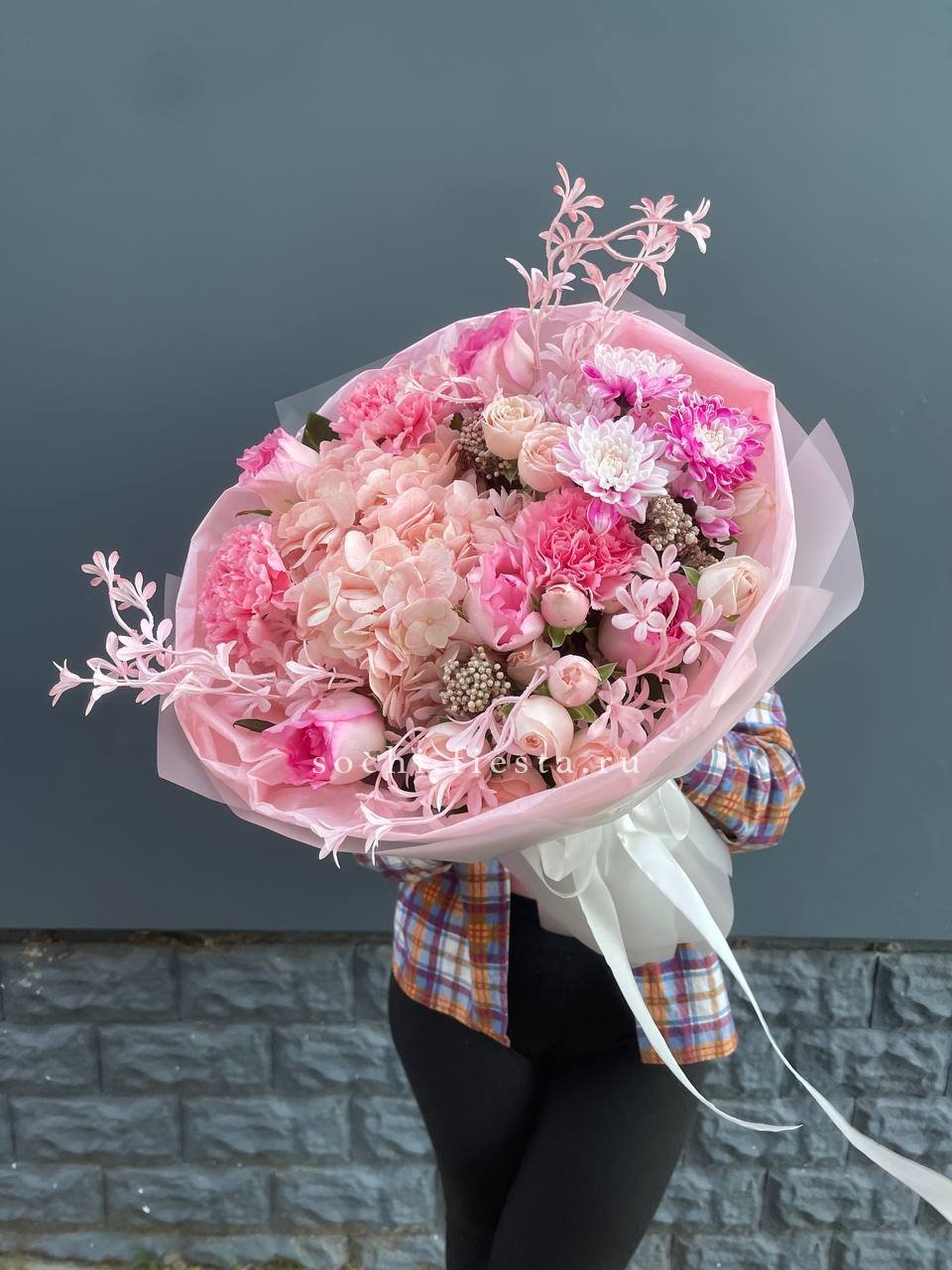 Воздушные соцветия гортензии переплетаются с бархатными бутонами диантусов и хризантем. Розы раскрываются среди зелени озотамуса. Композиция в пудровых оттенках с мягкой фактурой и объёмом.