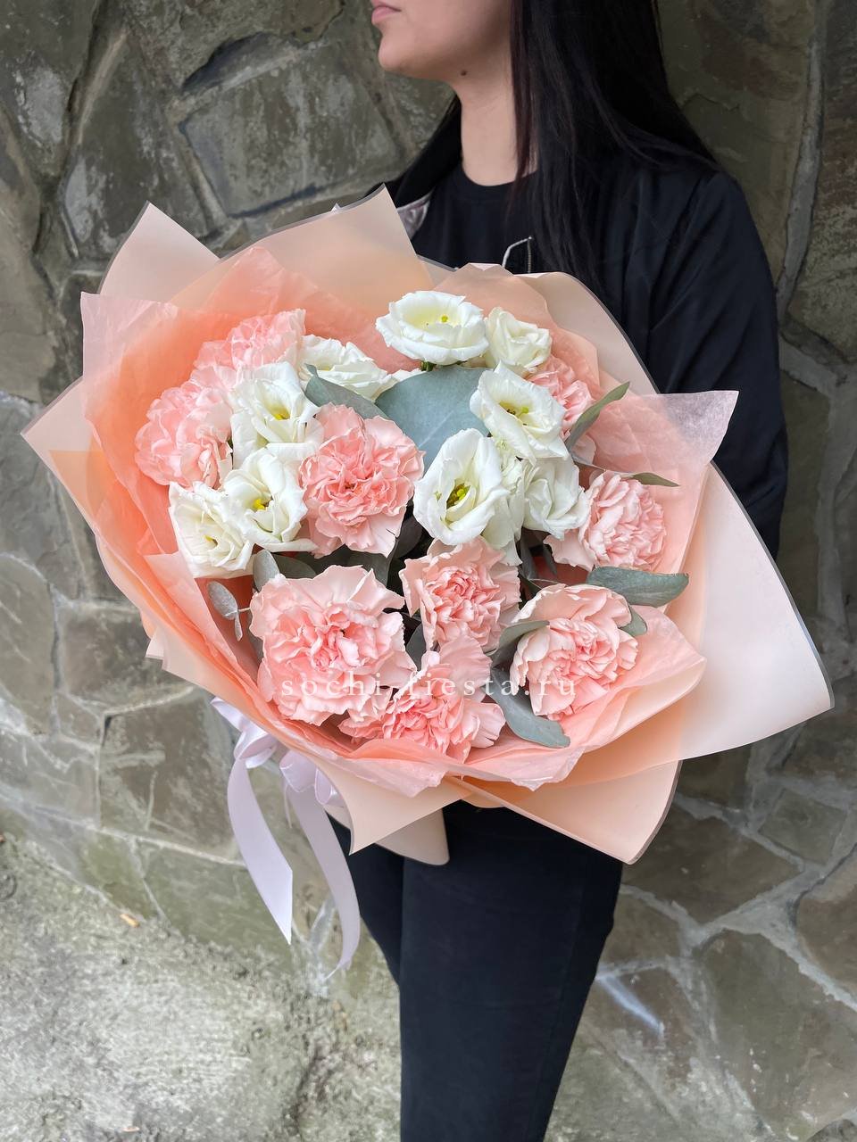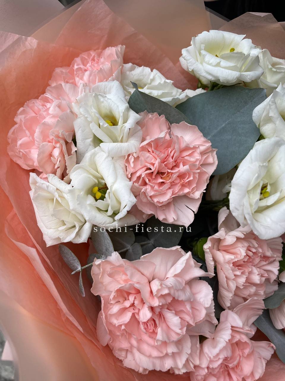 Состав: диантус, эустома, эвкалипт,  лента, дизайнерская пленка