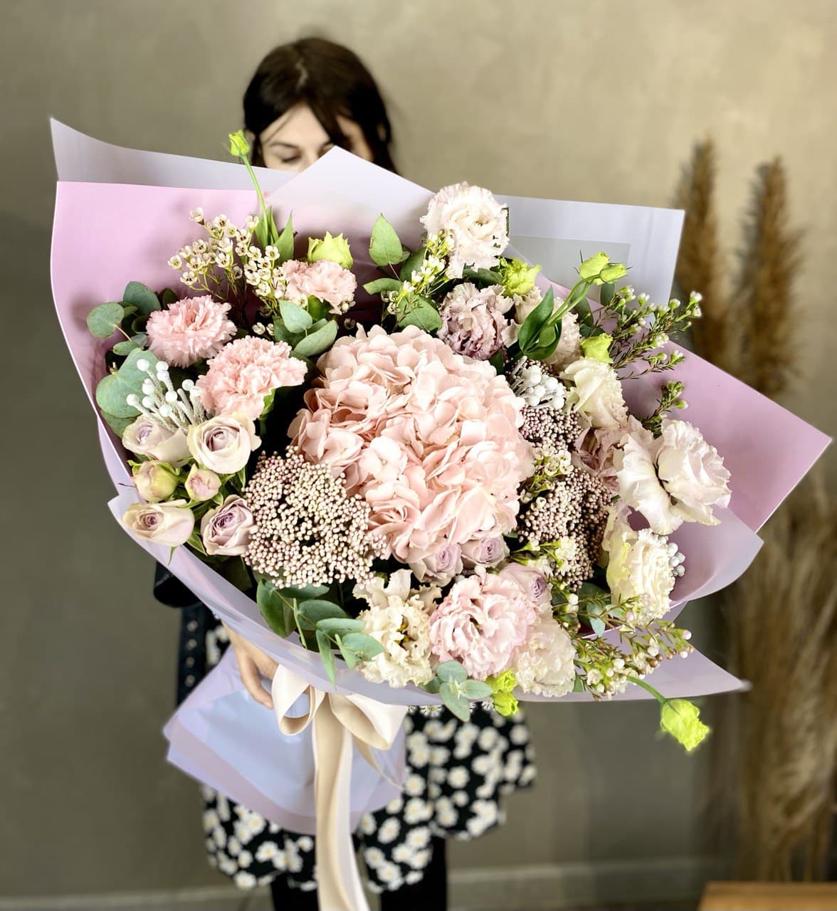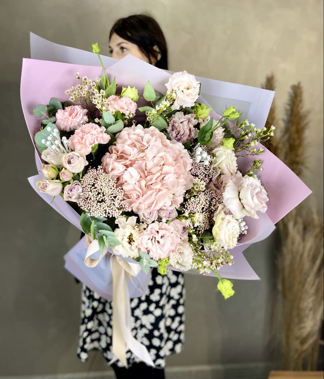 французские розы, маттиола, гортензии, эвкалипт, стифа, упаковка, лента.