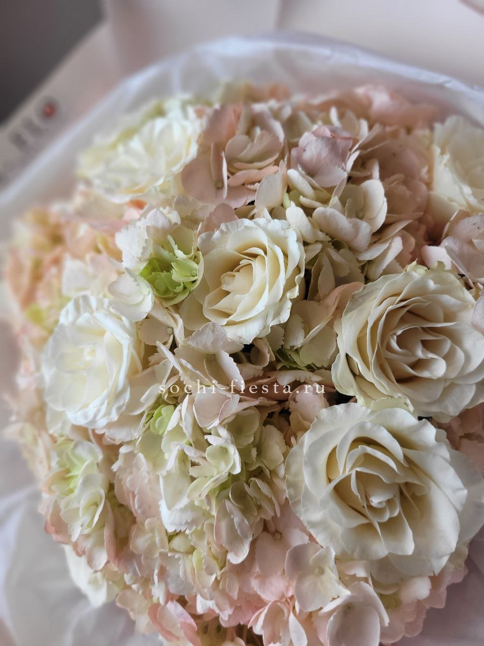 Пышные шапки гортензии создают воздушный объём, а белые розы добавляют графичности. Букет держит форму и легко размещается в любом пространстве.