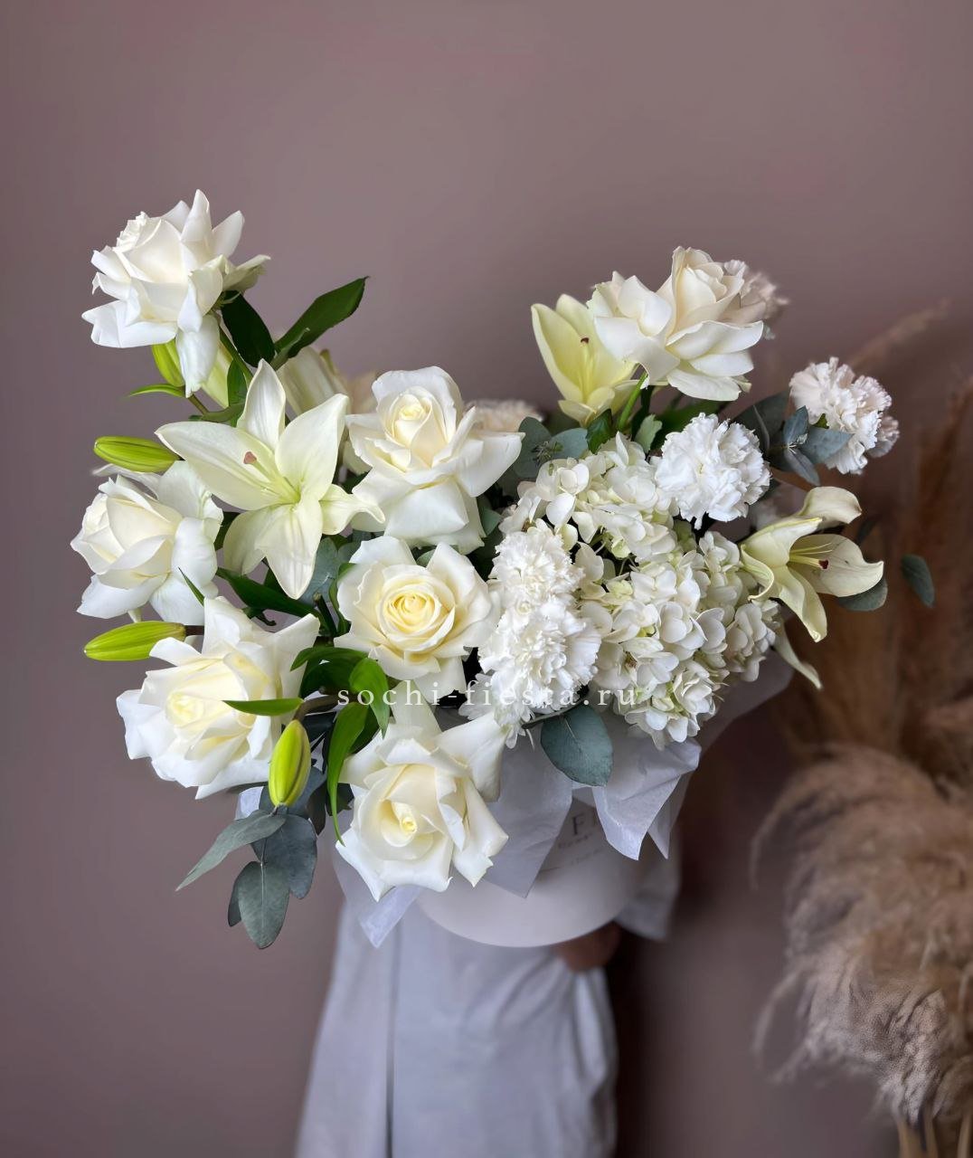 Белоснежная композиция с облачной гортензией и россыпью мелких соцветий создаёт ощущение морозного утра. Хлопок добавляет объём и мягкость силуэту.