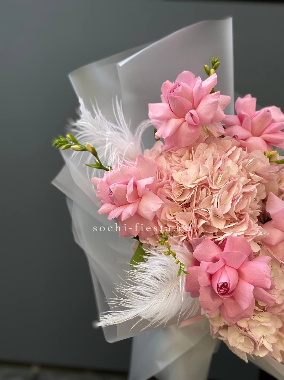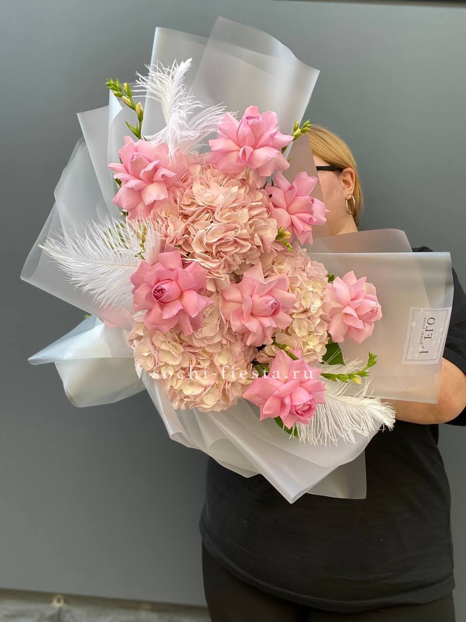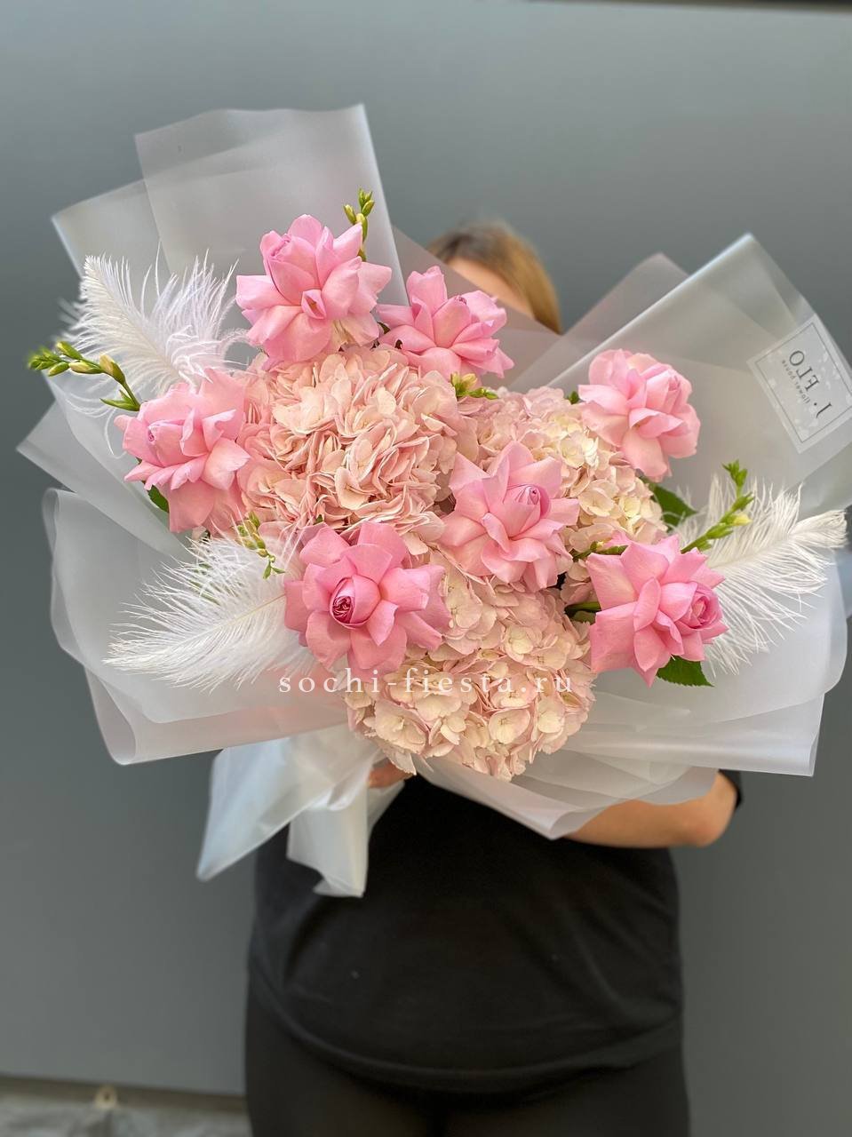 Для заказа товара " Букет из гортензий и розовых роз" с доставкой в Сириусе нажмите в корзину