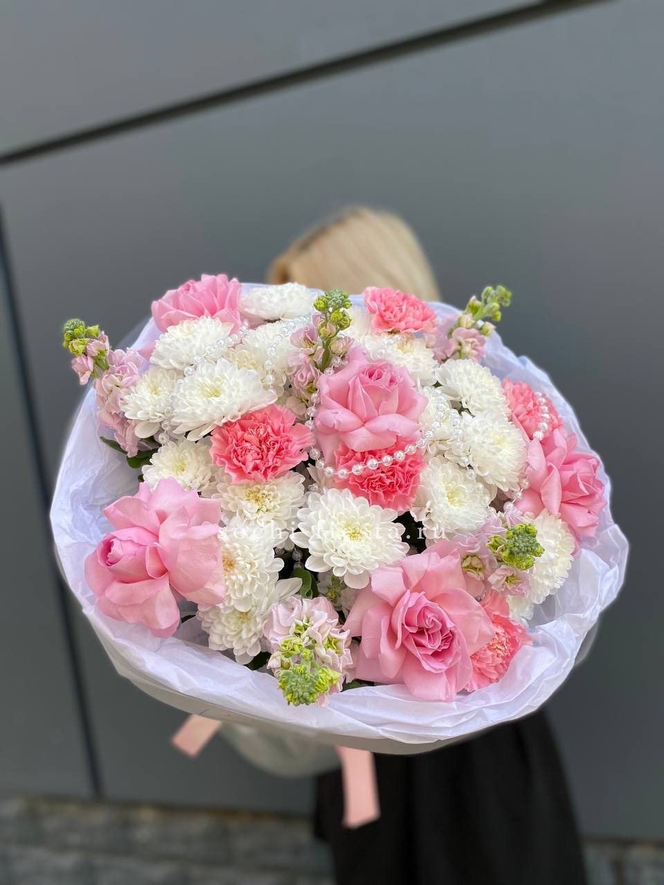 протея, роза кустовая, эустома, диантус, роза одноголовая, эвкалипт, озотамнус (по сезону) лента, дизайнерская упаковка.