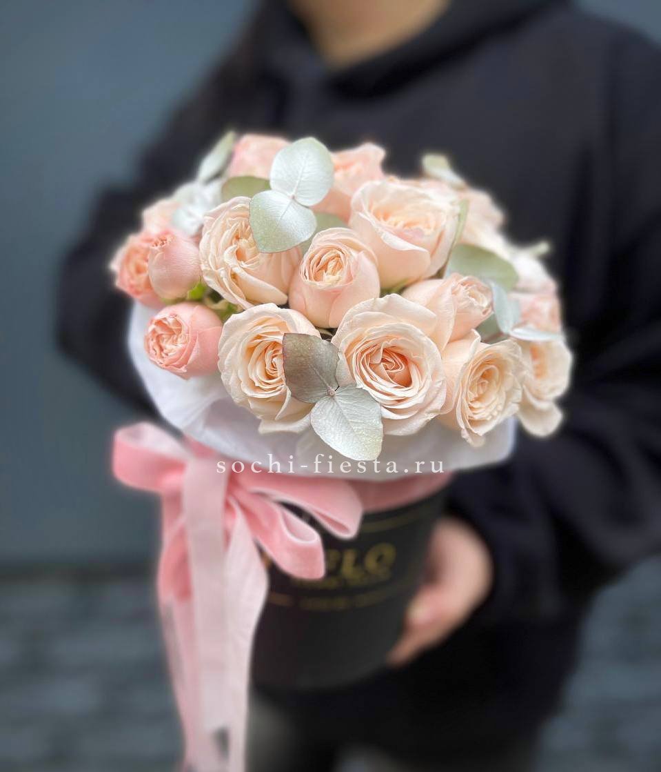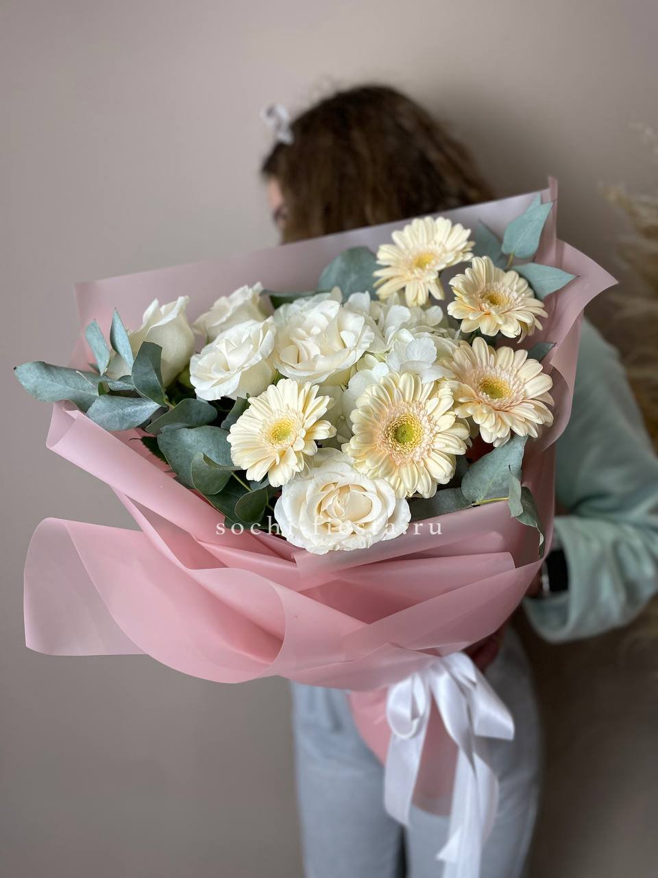 Пудровые и белые оттенки переплетаются в воздушной композиции. Бигуди, эустома и гортензия создают мягкое цветовое пятно, где каждый элемент дополняет общий ритм.