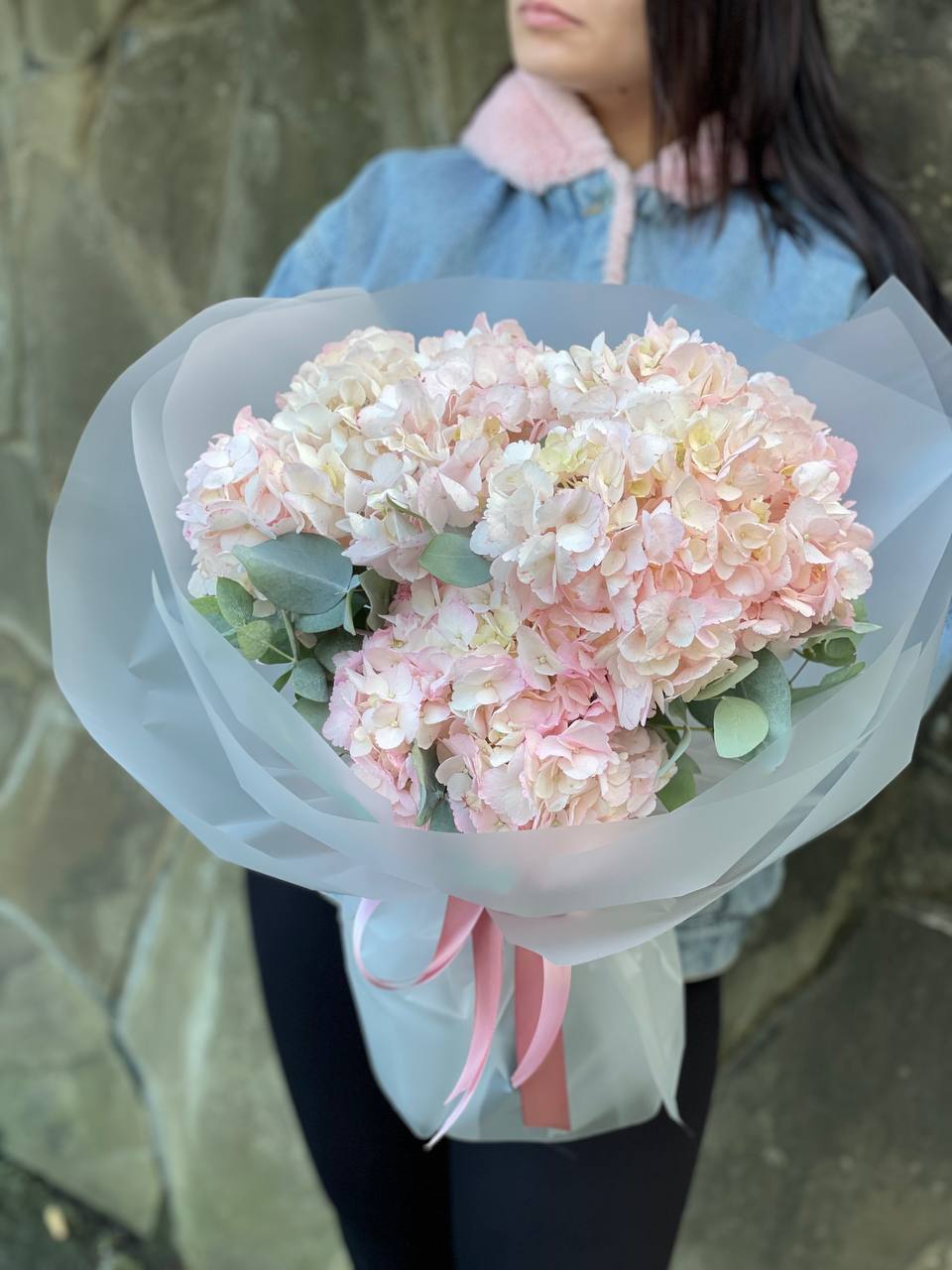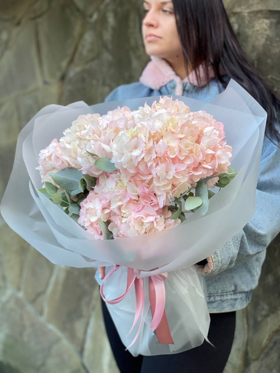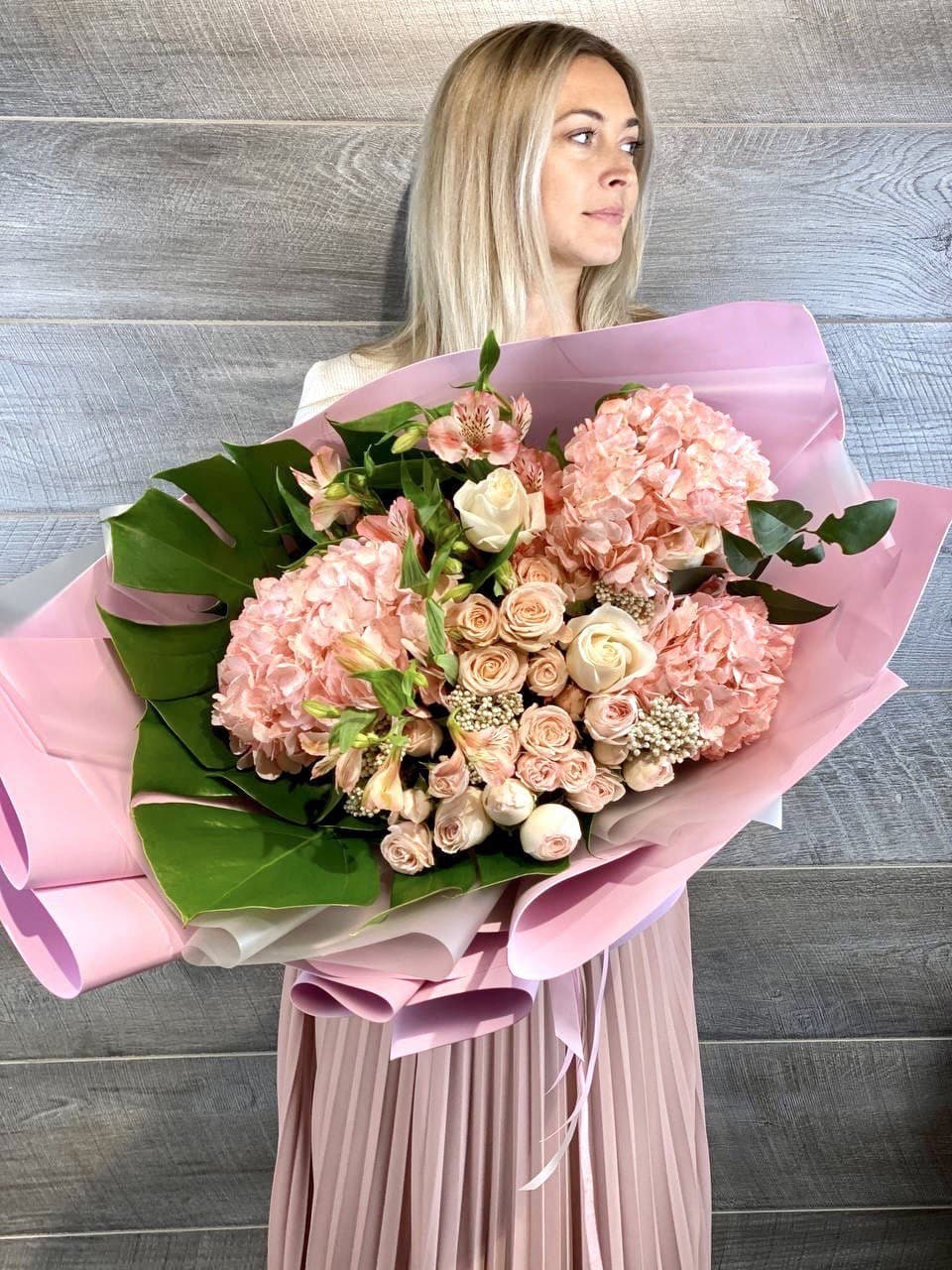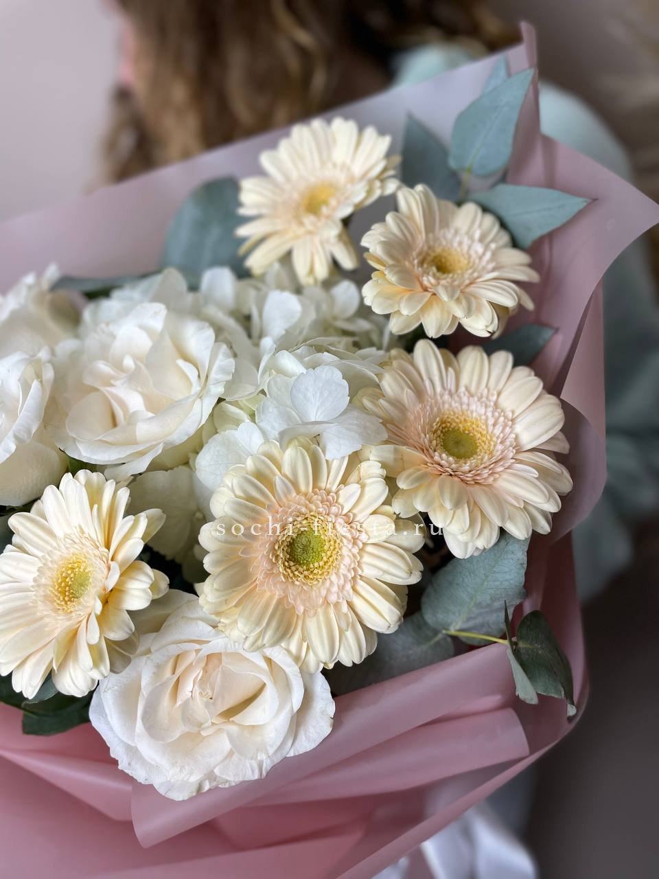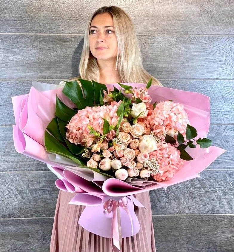 бигуди, гортензия, мисти баблс, розы, эустома, озотамус в нежном оформлении.
