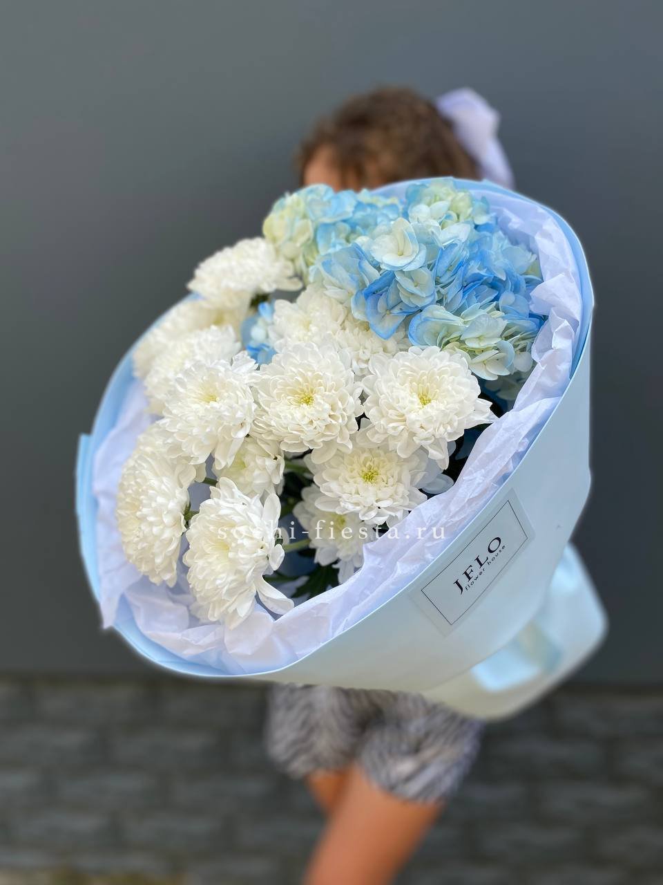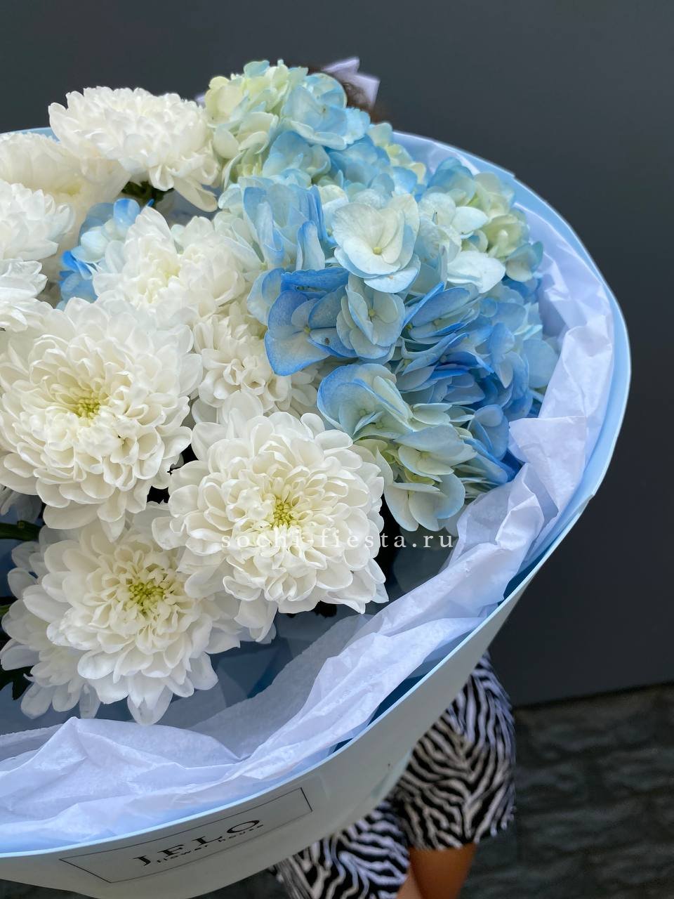Авторский букет в составе которого:  гортензии, хризантемы, лента и дизайнерская пленка.