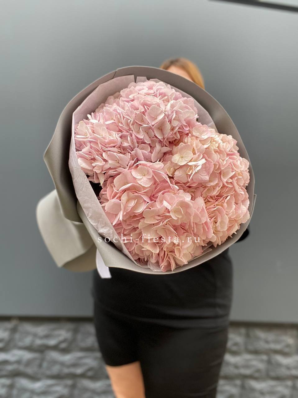 хризантема кустовая, гортензия, мисти баблс, розы в нежном оформлении.