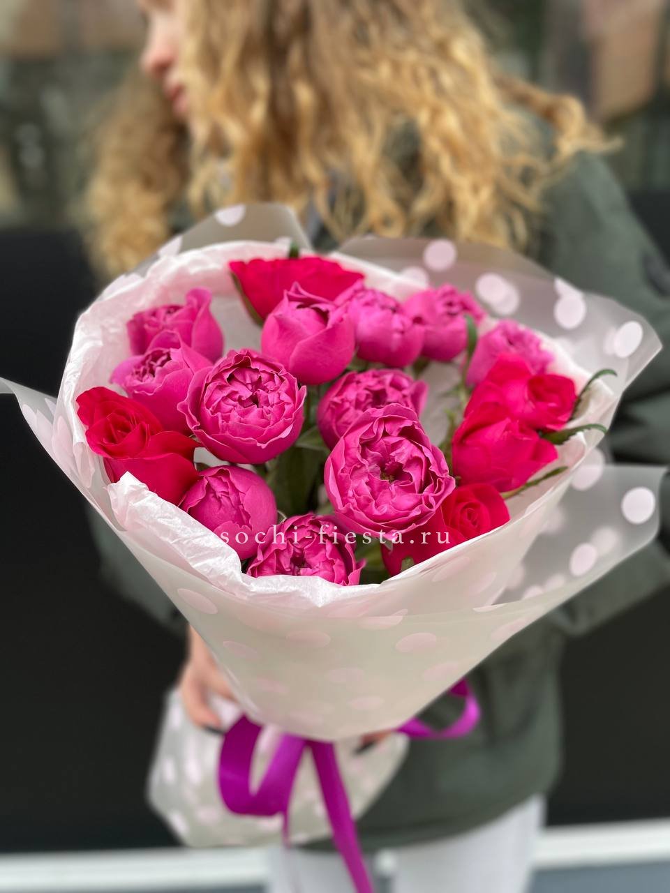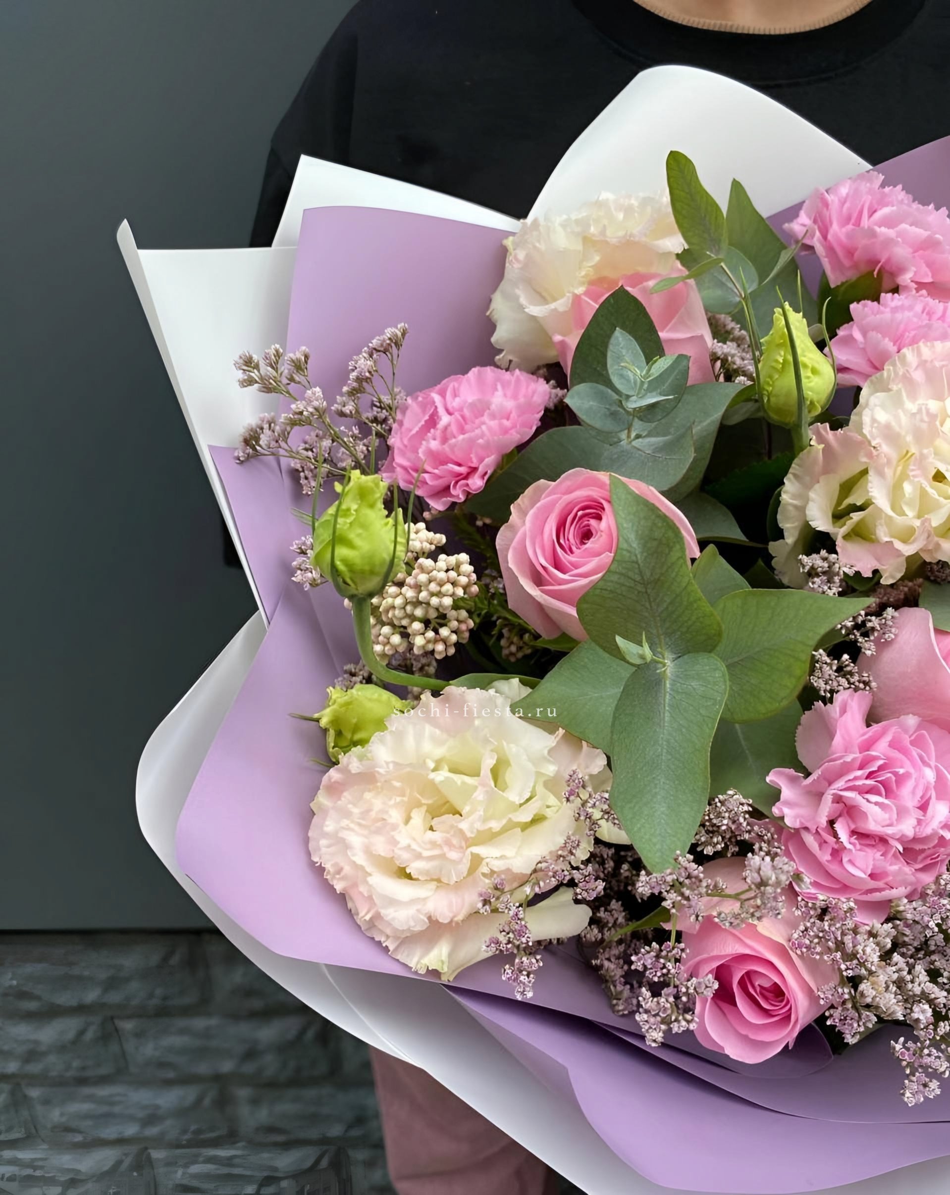 Состав: диантусы, эустома, розовые розы, лимониум(или аналог), озатамус, эвкалипт