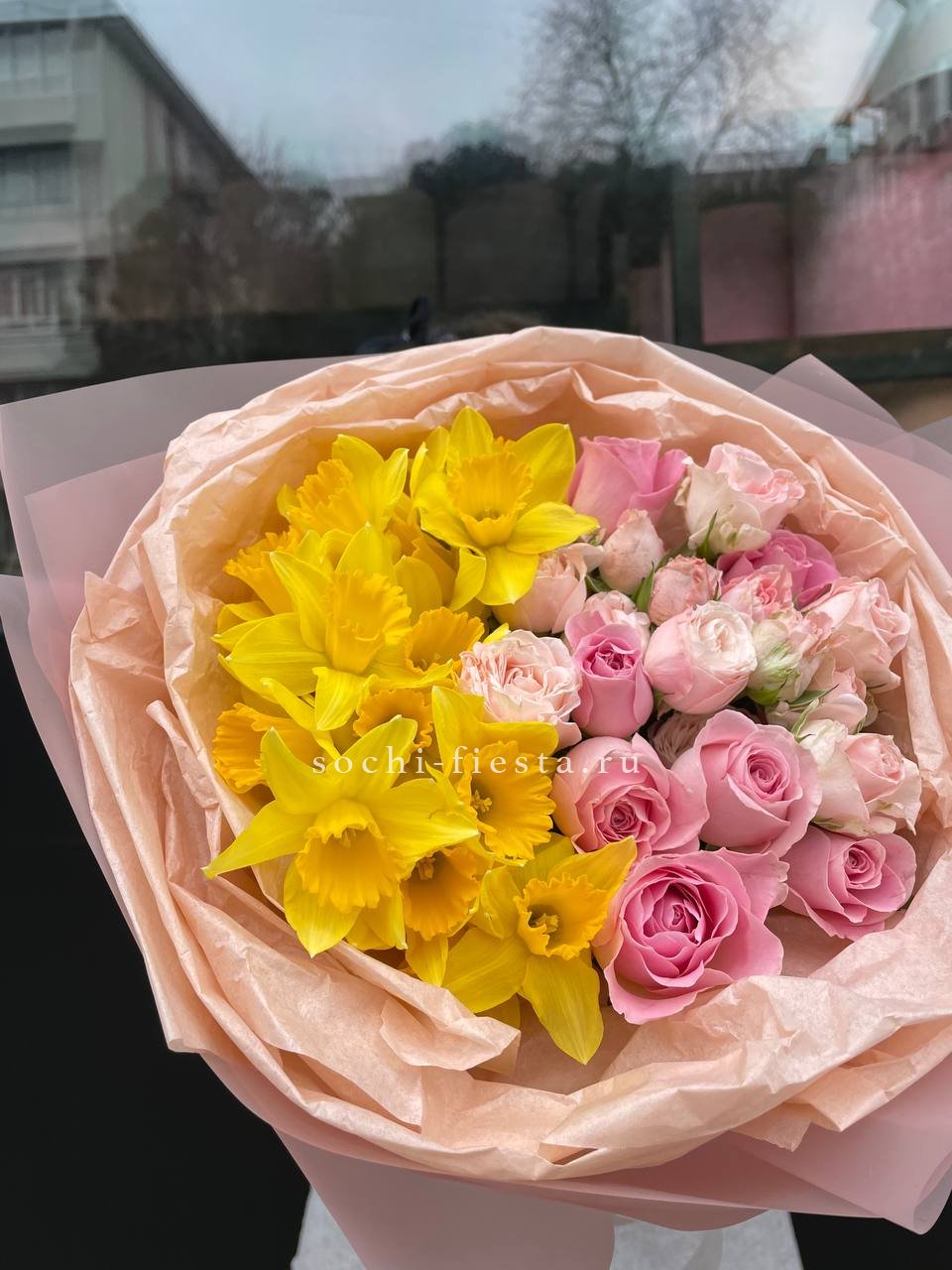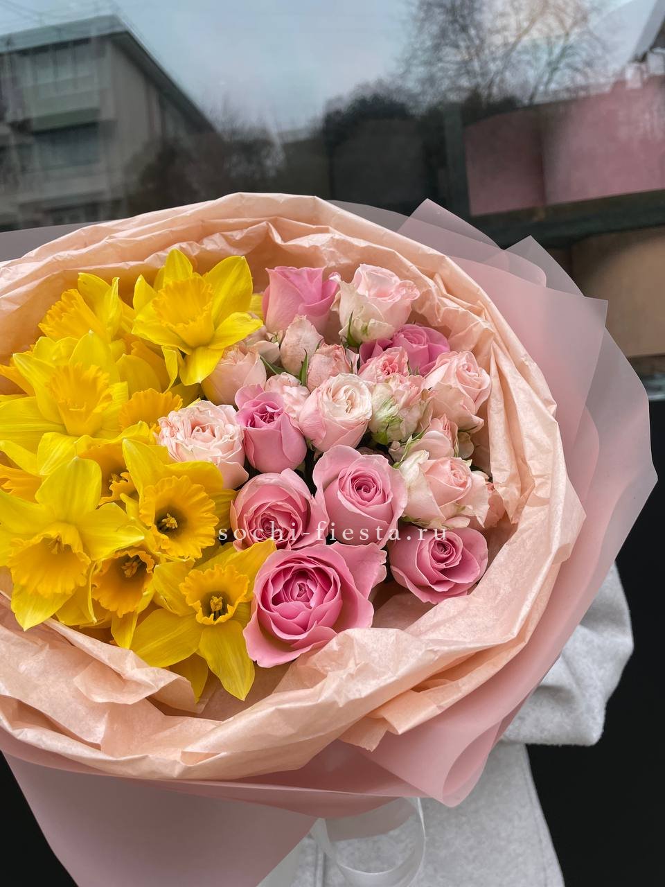 Состав: нарцисс, роза, пионовидная роза, авторское оформление
