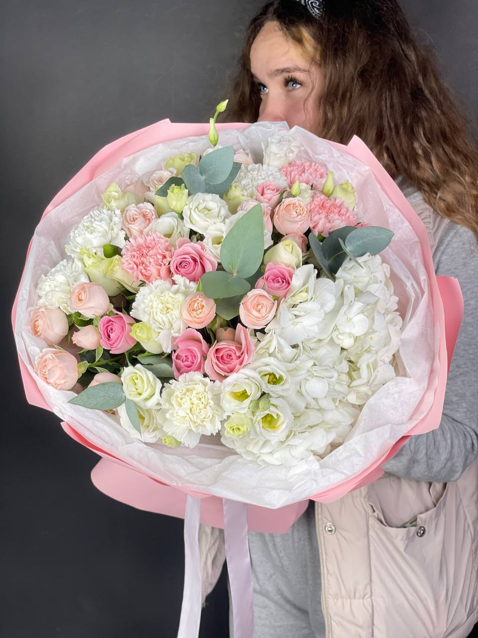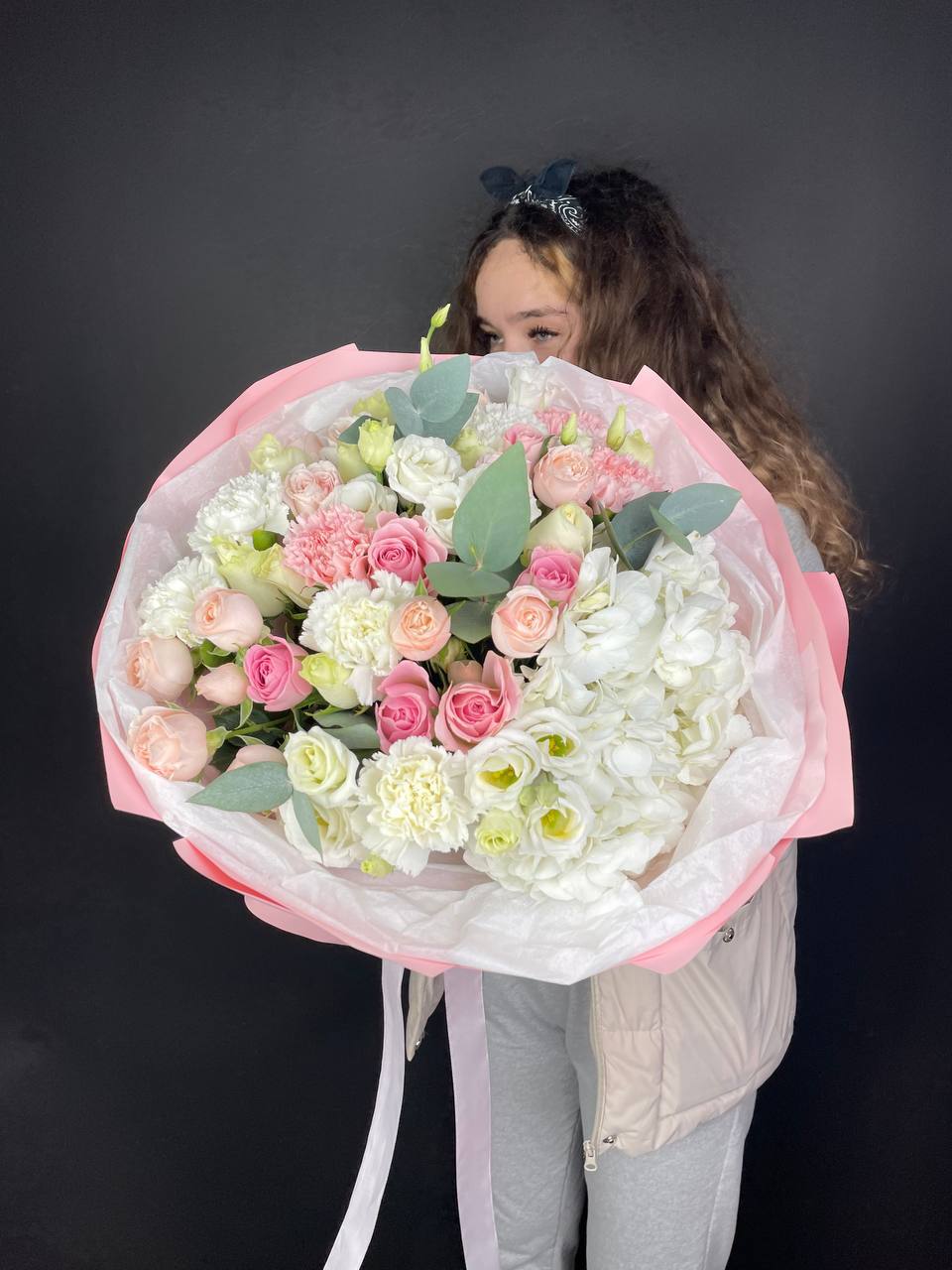 гербера, роза, хлопок, гортензия, диантус, эвкалипт, упаковка.
