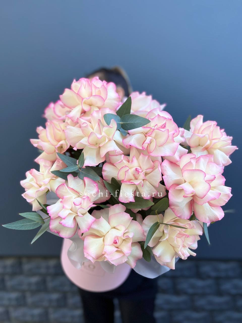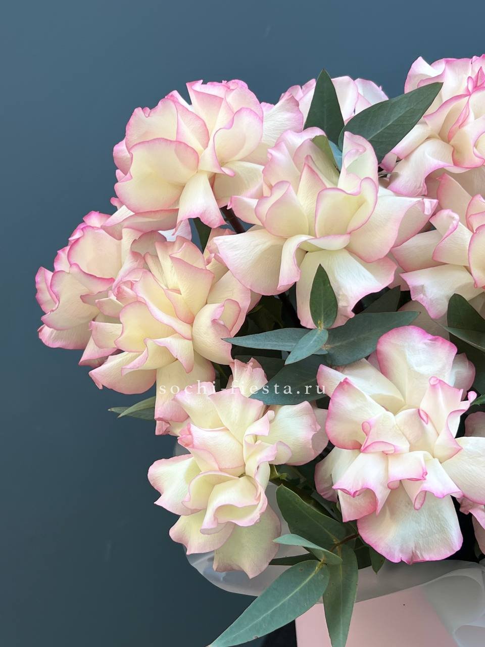 кустовые розы, кремовые розы, диантусы, эвкалипт лента и дизайнерская пленка.