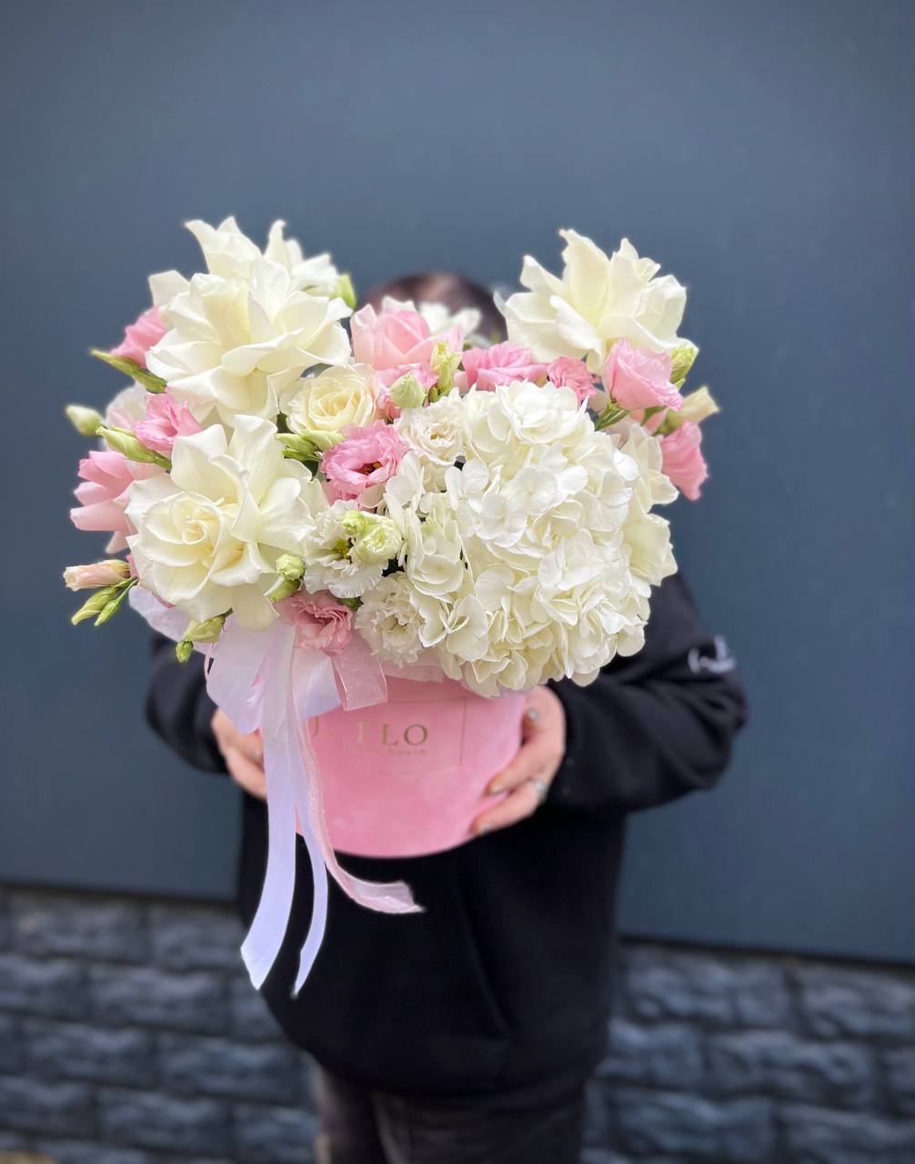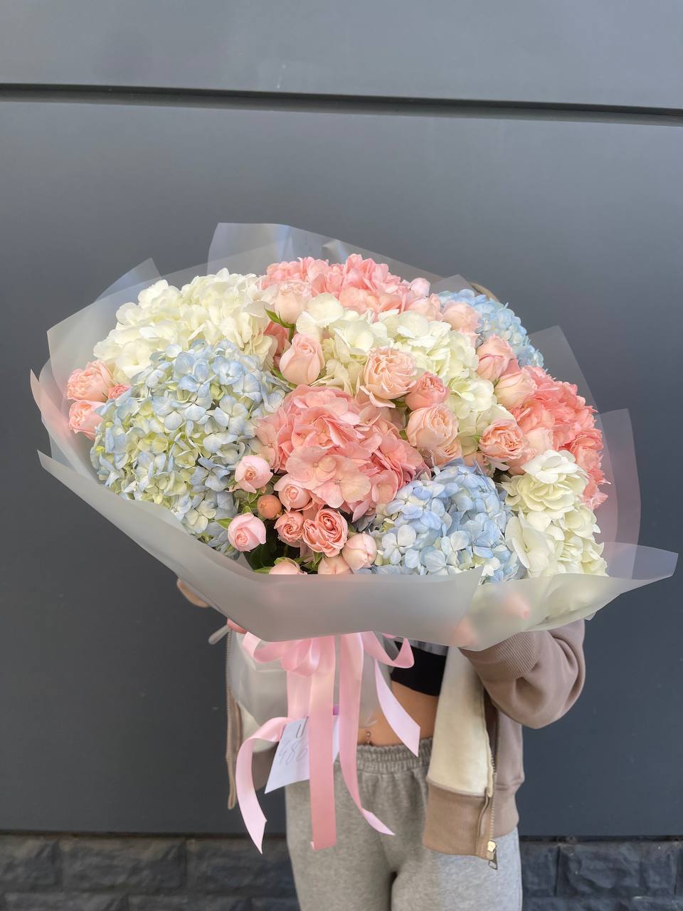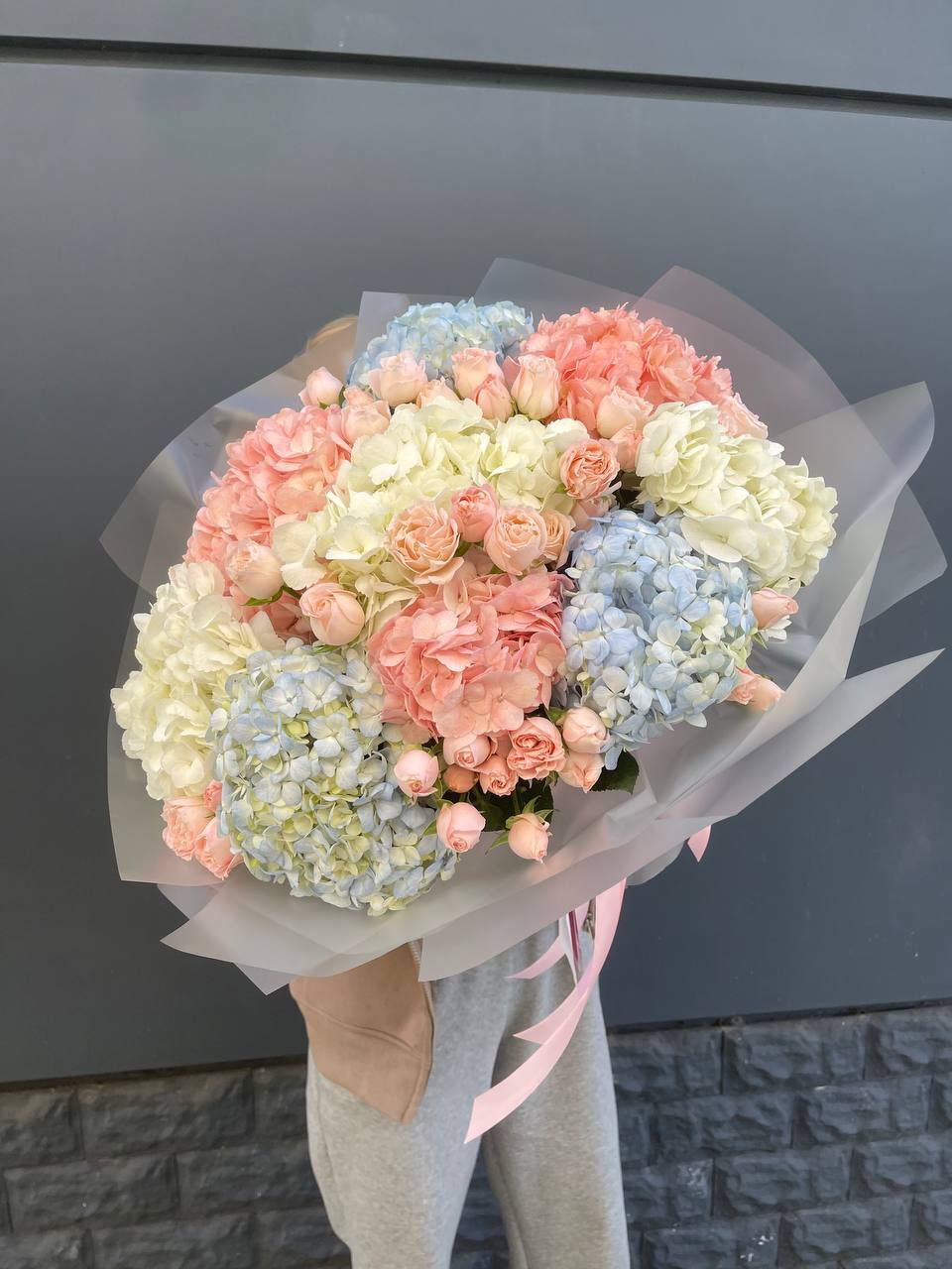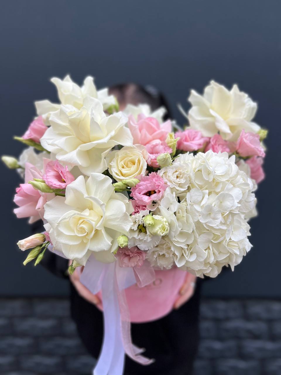Масштабная композиция с пионами, эустомой и розами разворачивается во всей красе. Хризантемы и гортензия создают впечатляющее присутствие, которое преображает пространство вокруг.