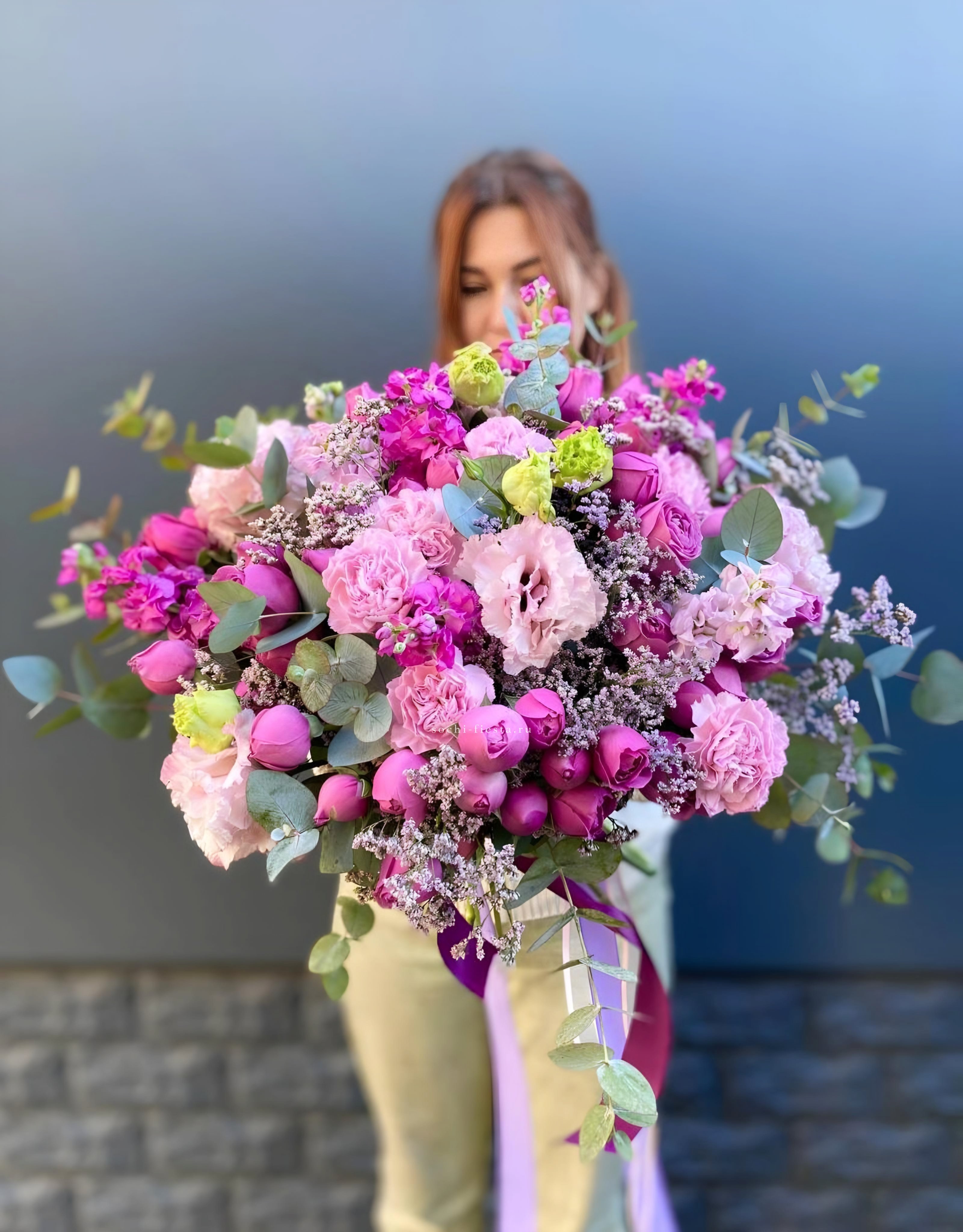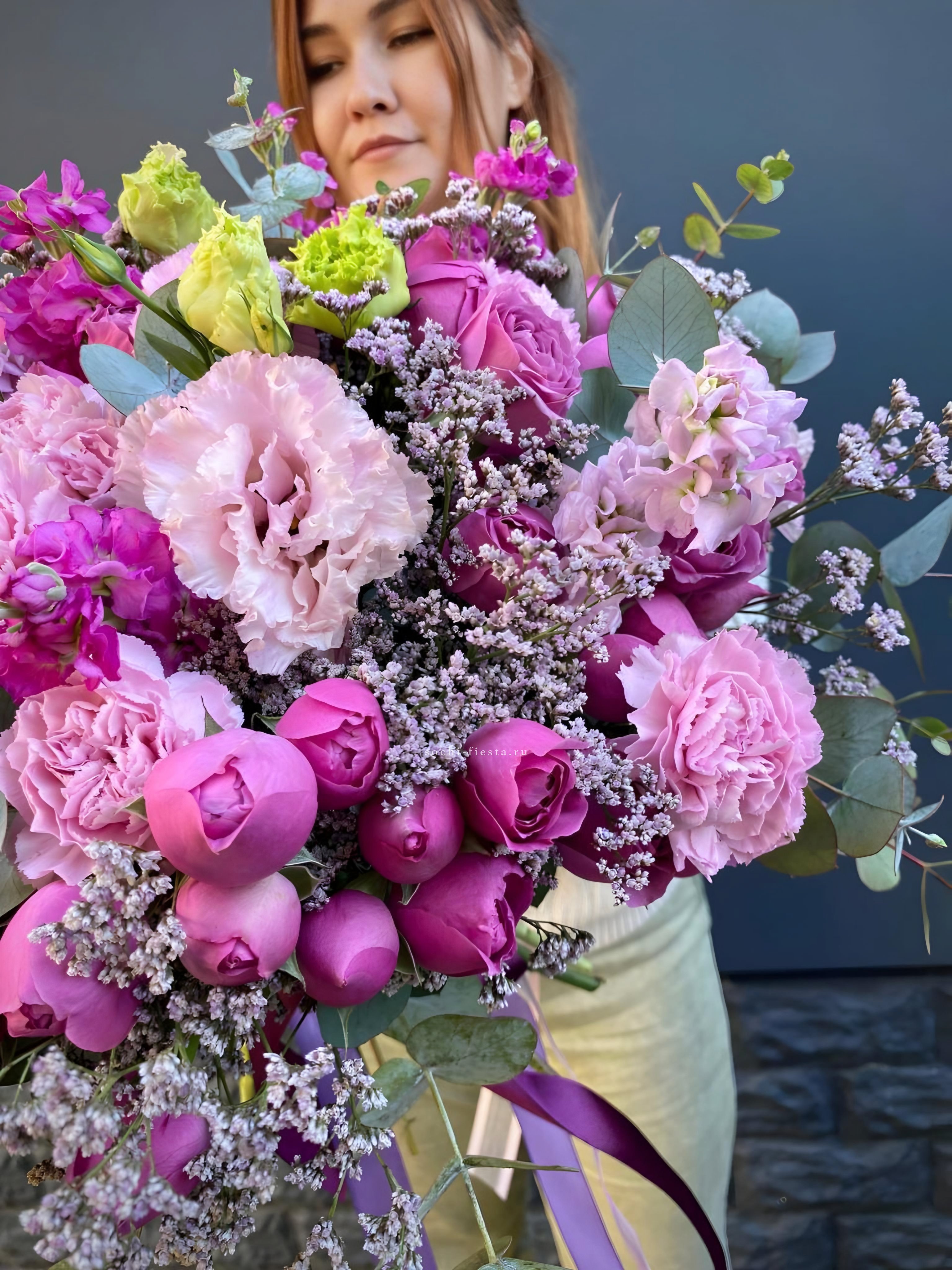 Состав: маттиола, диантусы, пионовидные розы Мисти Баблс, эвкалипт, лимониум, эустома лента, упаковка
