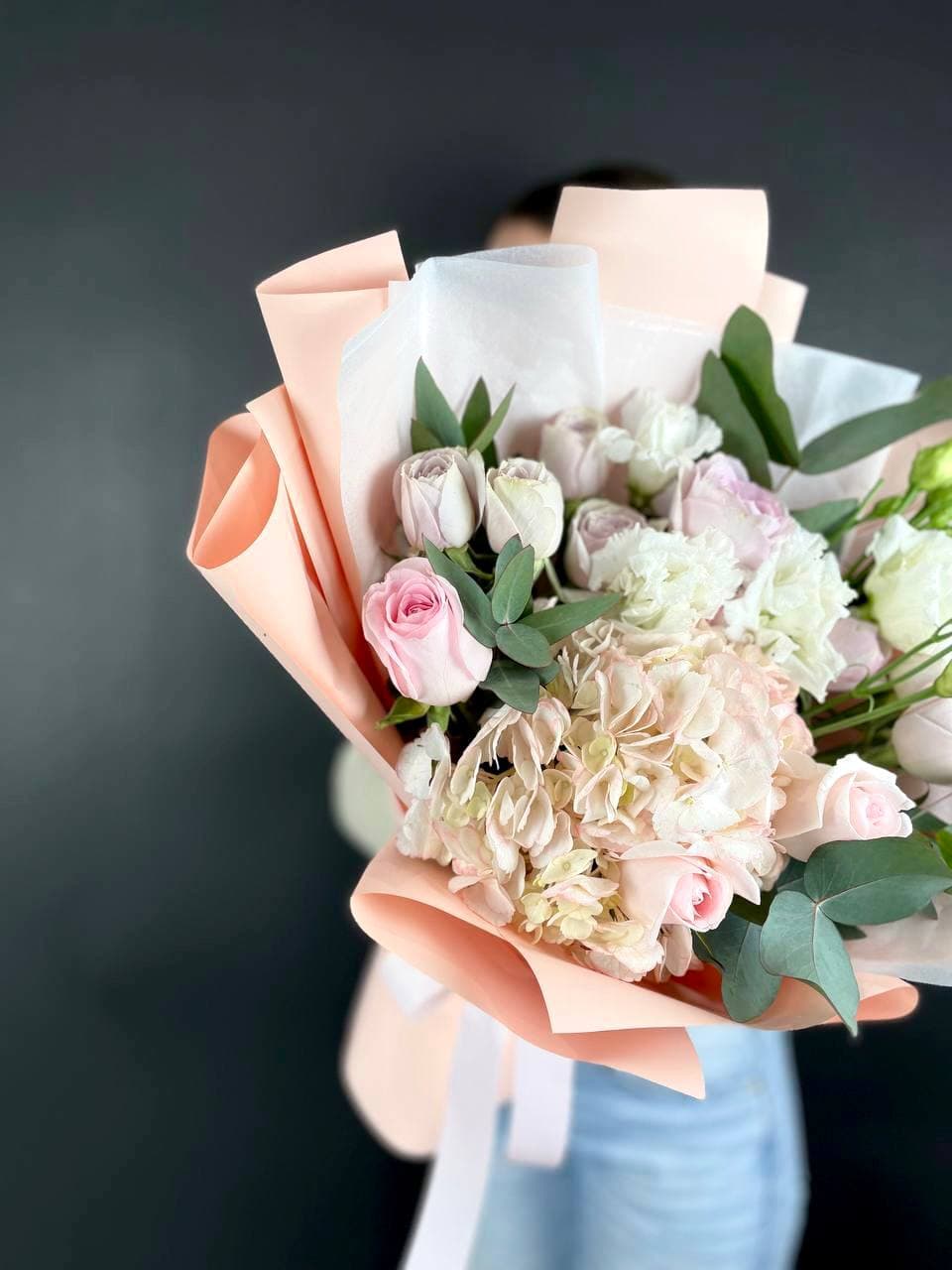 Состав: гортензия, розы, эустома, кустовая пионовидная роза, эвкалипт, лента, дизайнерская упаковка