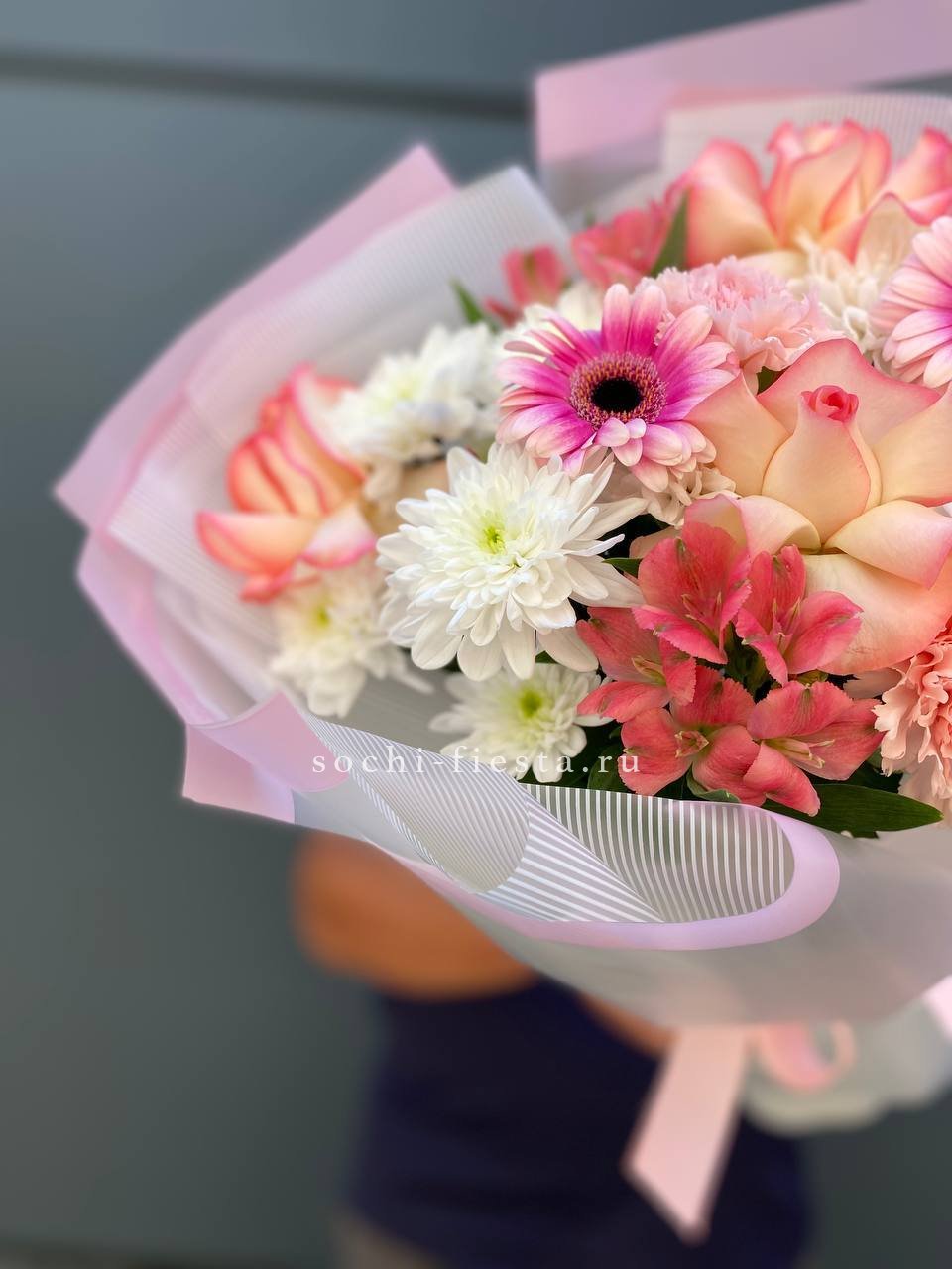 Состав: хризантема кустовая, гербера, роза французская, диантус, альстромерия, лента, дизайнерская пленка