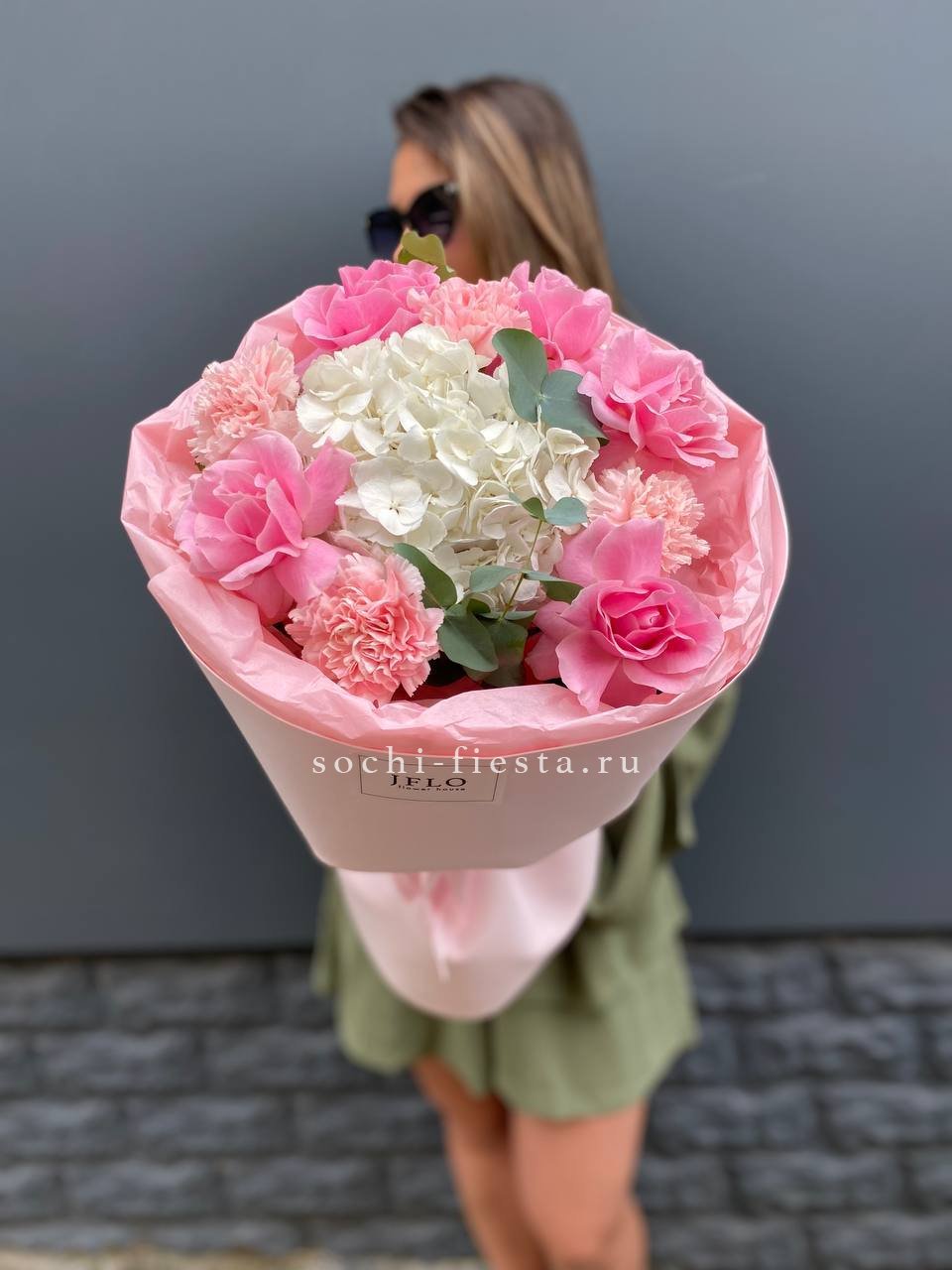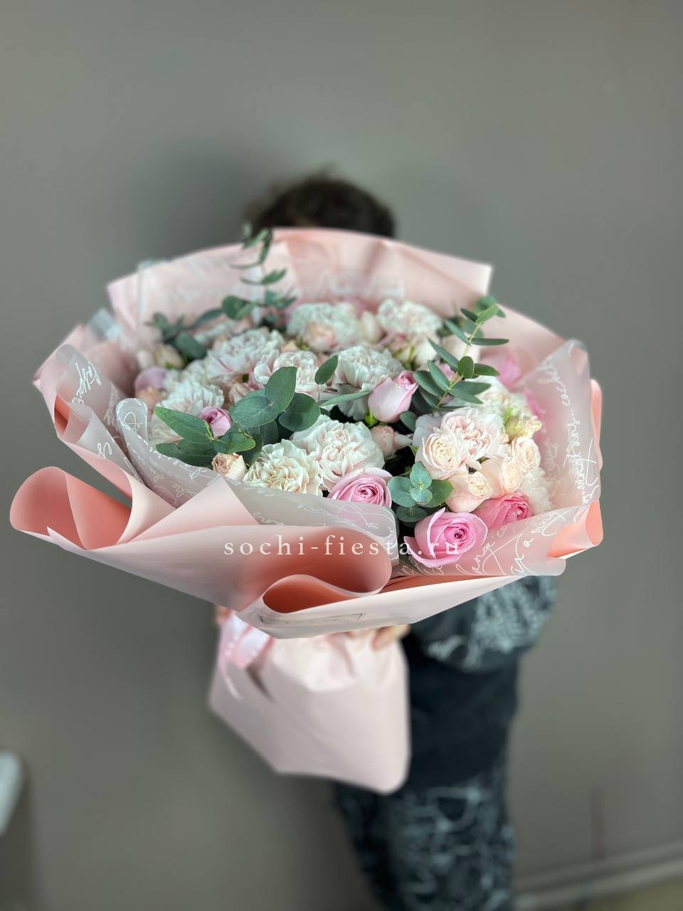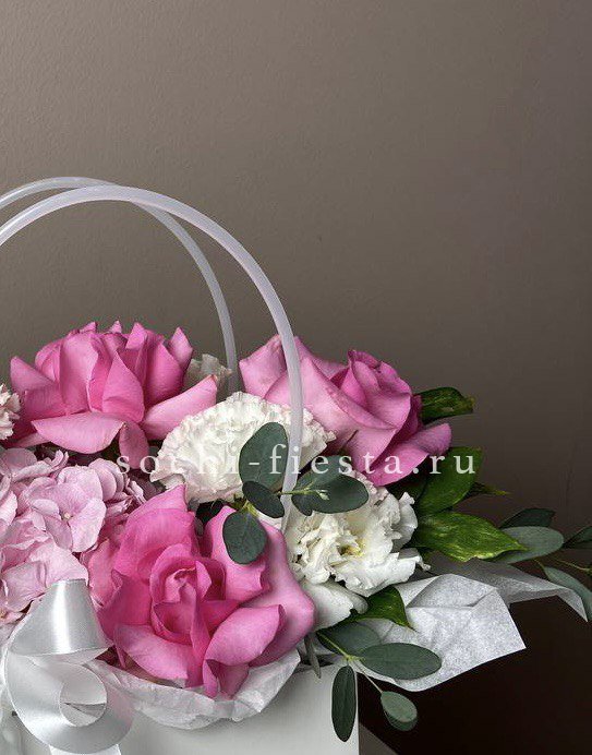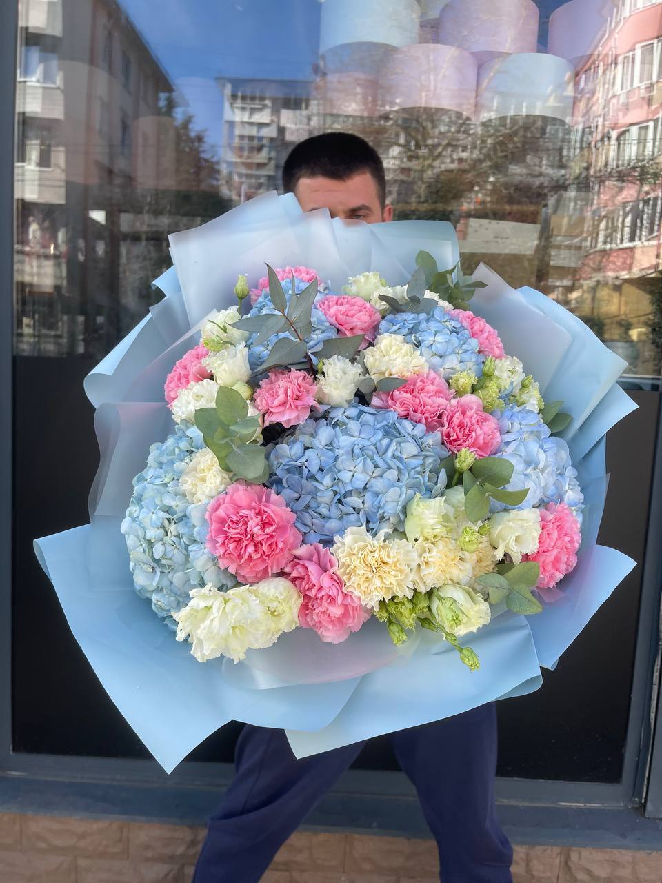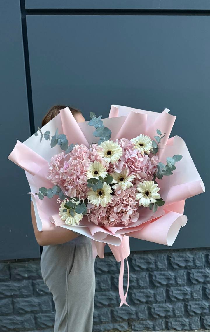 гортензия, эустома, диантус, эвкалипт, пленка.