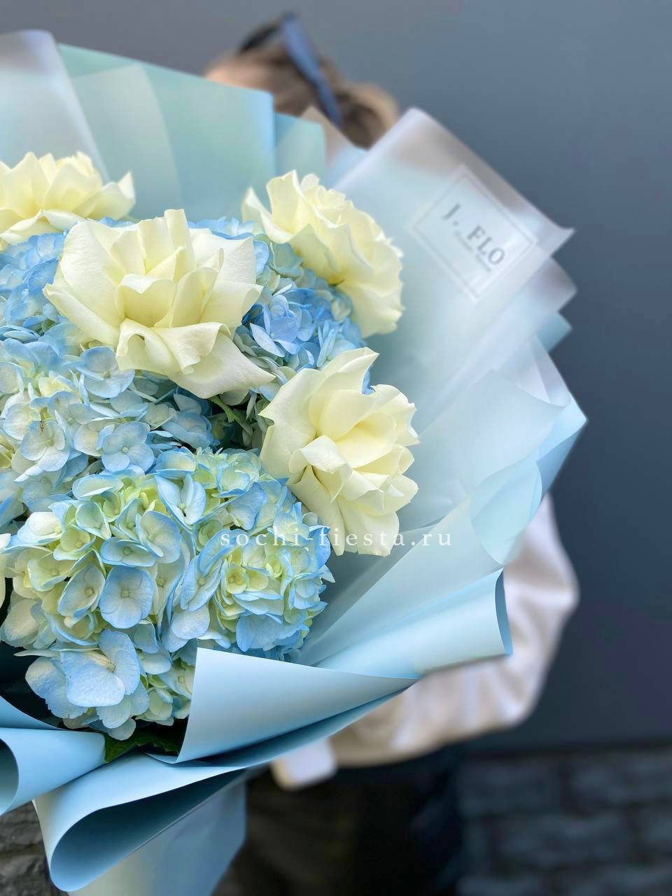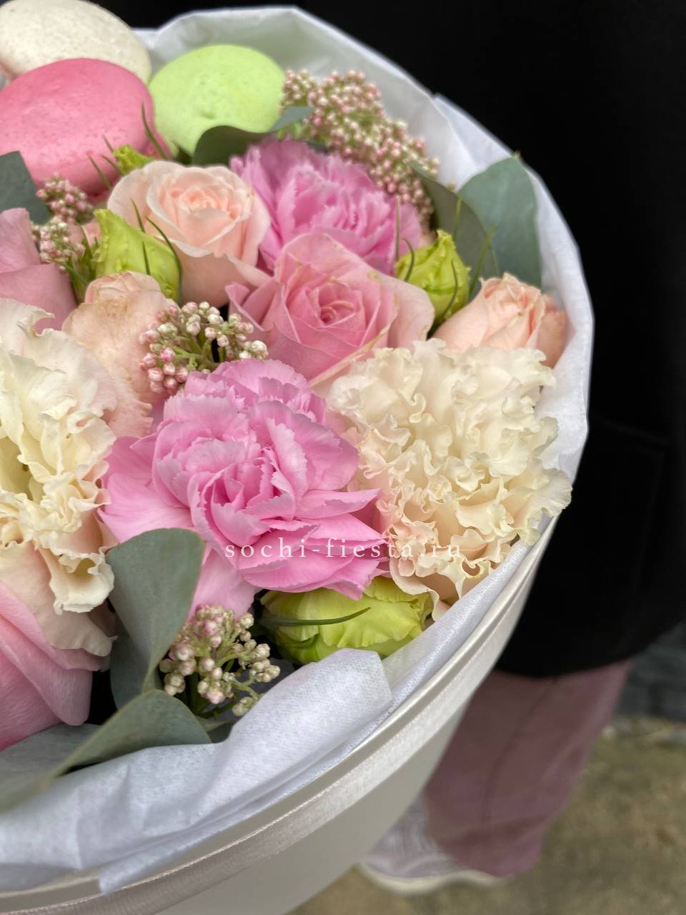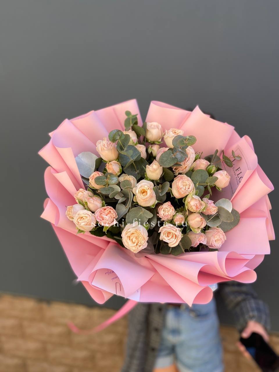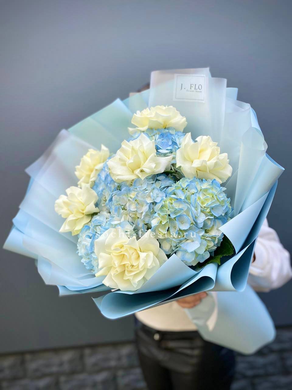 гортензия, эустома, диантус, эвкалипт, пленка.