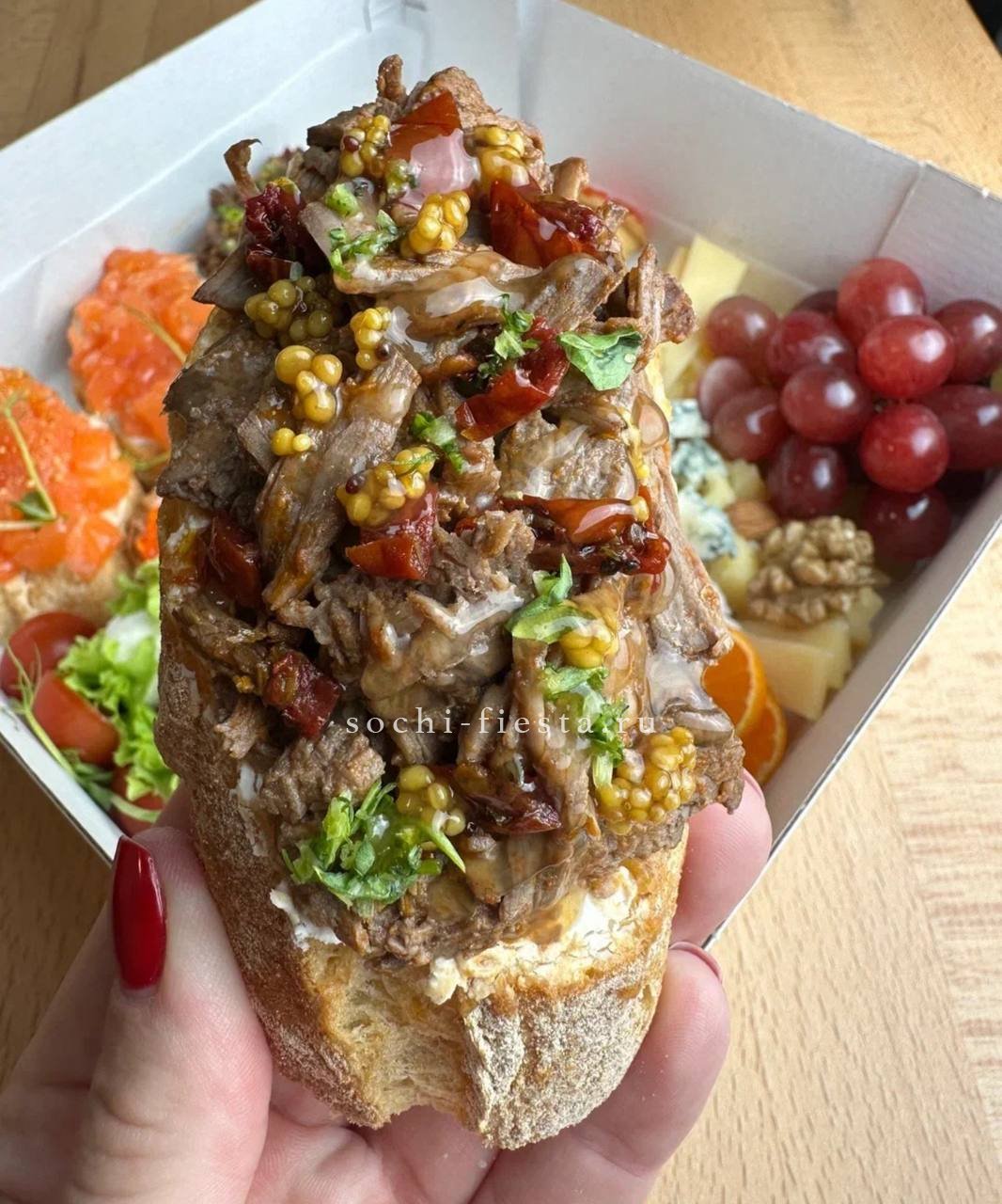 Набор для двоих с морепродуктами и сырами. Брускетты с говядиной и лососем, круассаны с ягодами, тарталетки с икрой и канапе капрезе собраны в одном боксе для камерного угощения.