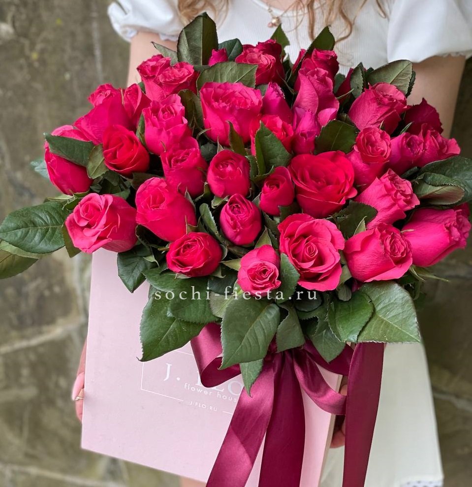 Состав композиции: алые розы - 55 шт., коробка куб D25, тишью