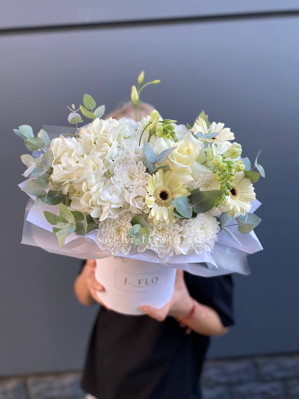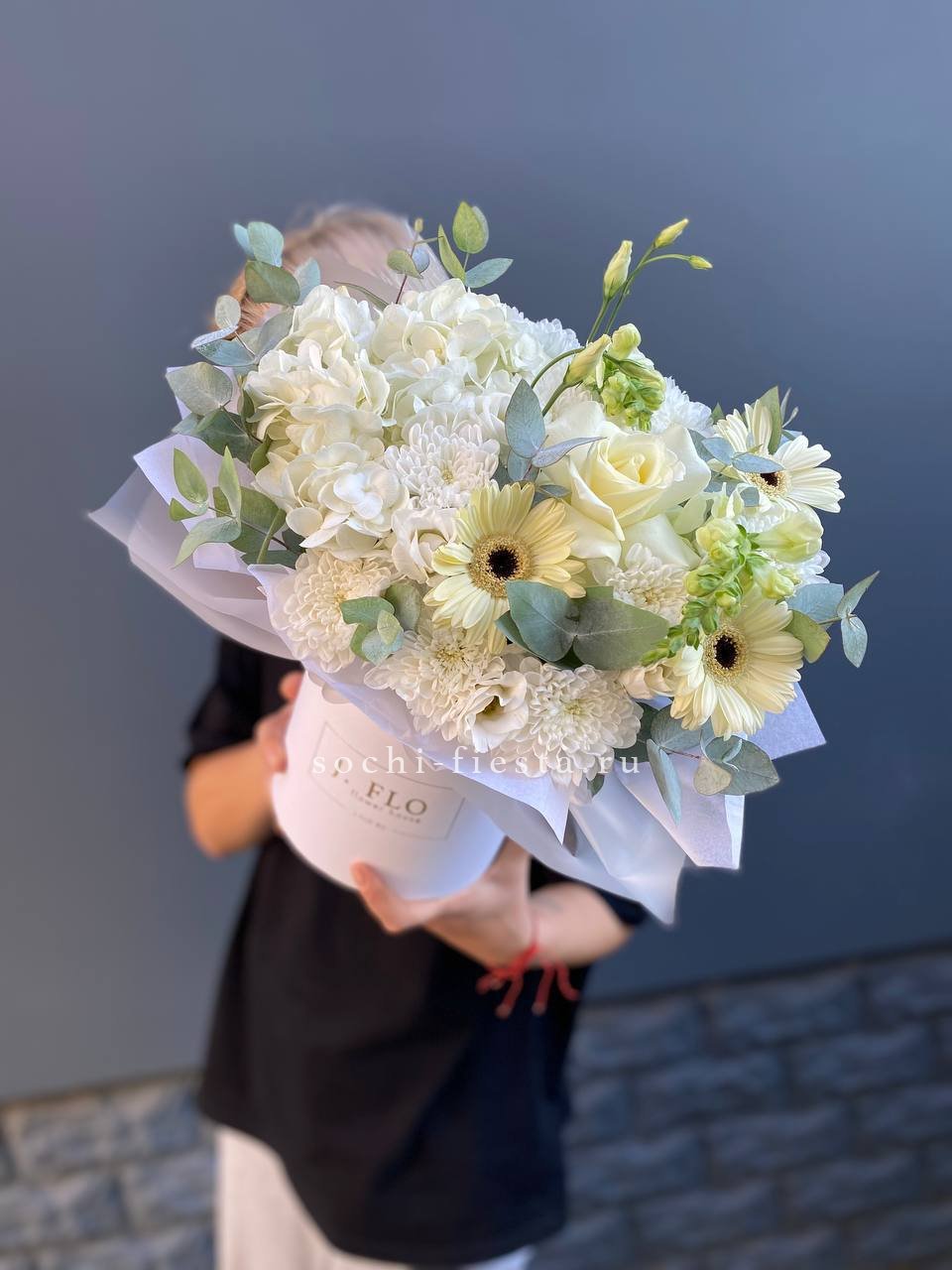 Белоснежные розы и воздушная эустома соседствуют с пышной гортензией и яркими вспышками статицы. Композиция собрана плотно, каждый цветок находит своё место в общем ритме.