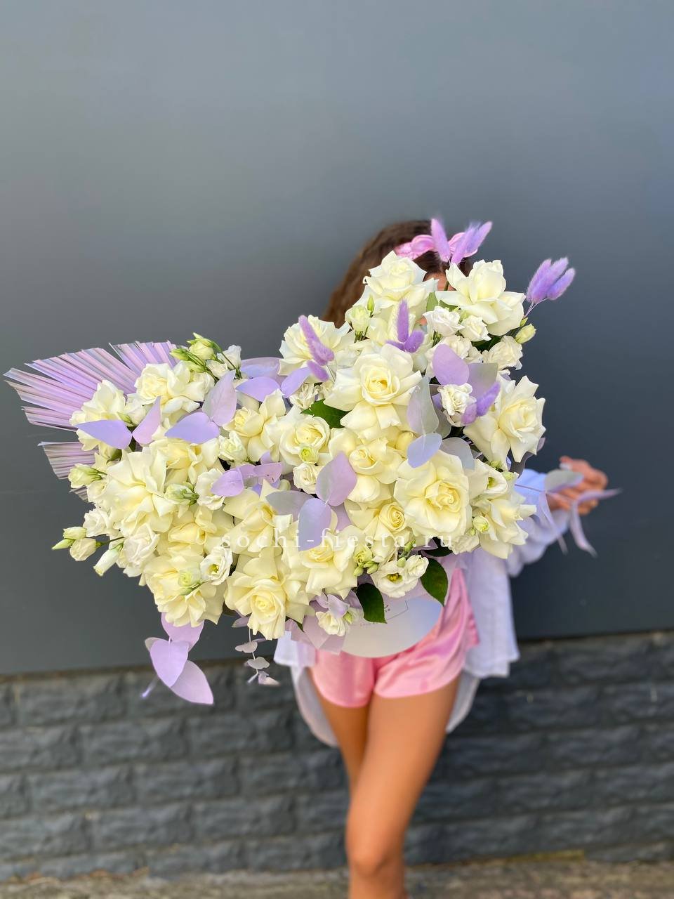 Белые французские розы раскрываются крупными бутонами и соседствуют с воздушной эустомой. Композиция создает ощущение легкости и света.