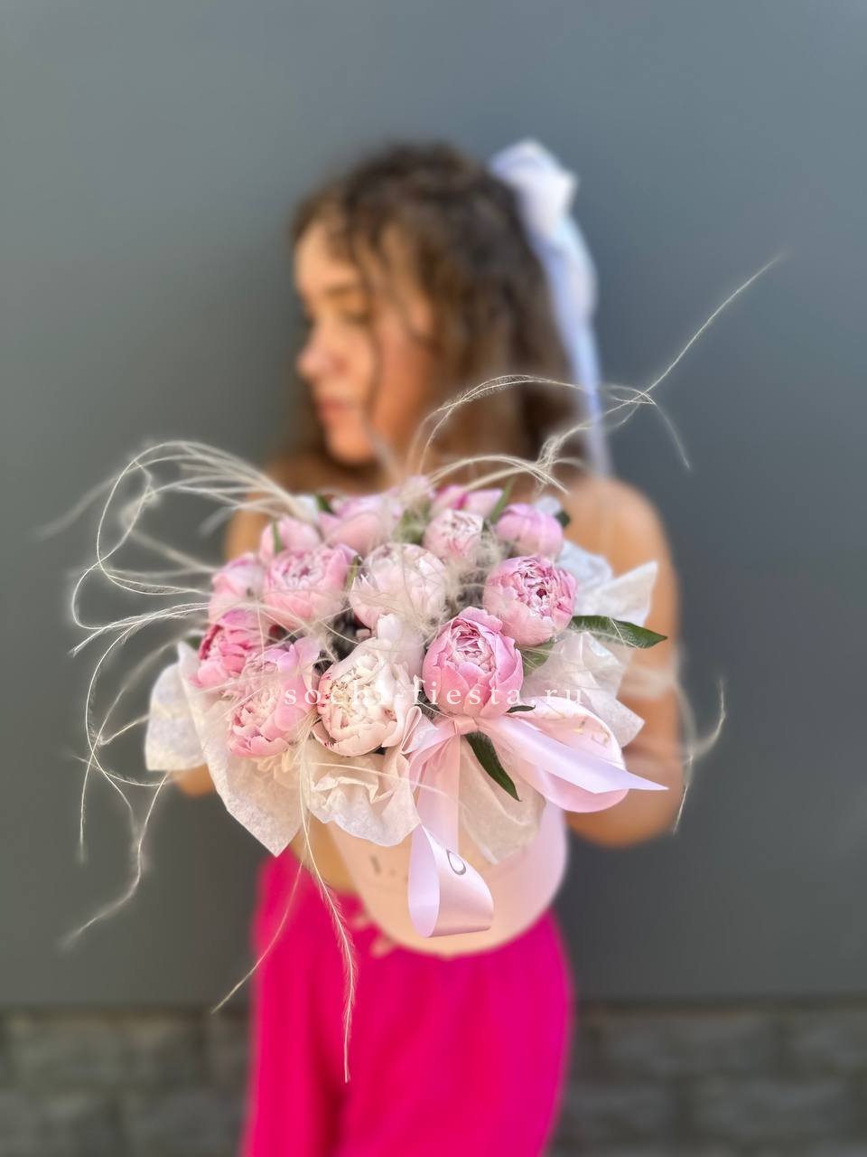 Состав: 15 пионов, стифа, цилиндр D13