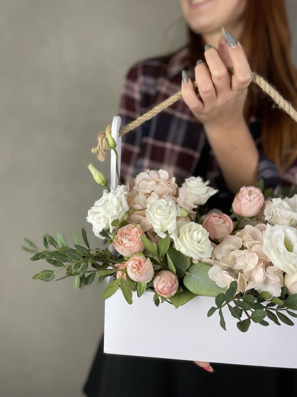 Состав: эустома, кустовая роза, фисташка, гортензия, деревянный ящик