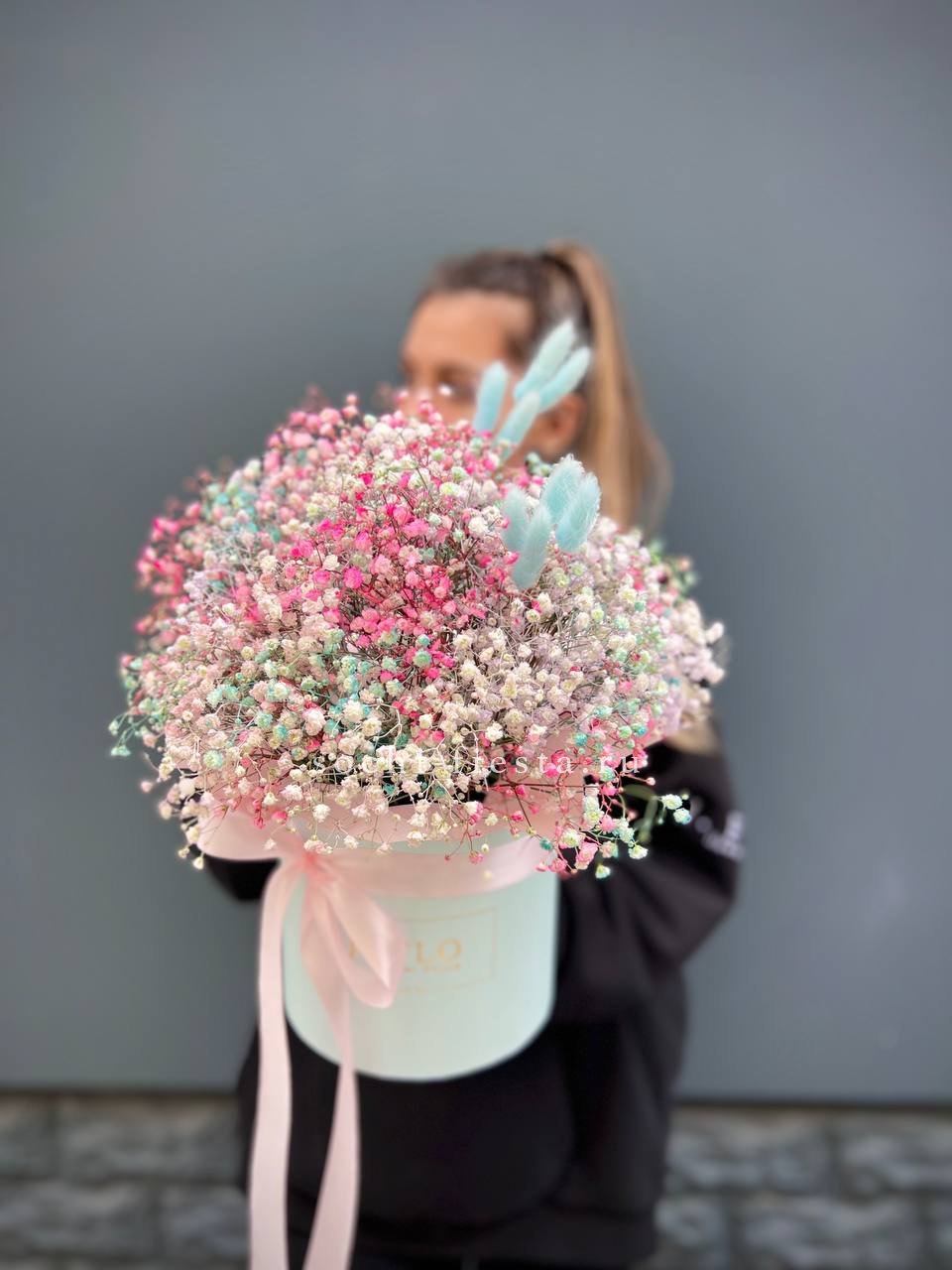 9 Радужных гипсофилы в шляпной коробке