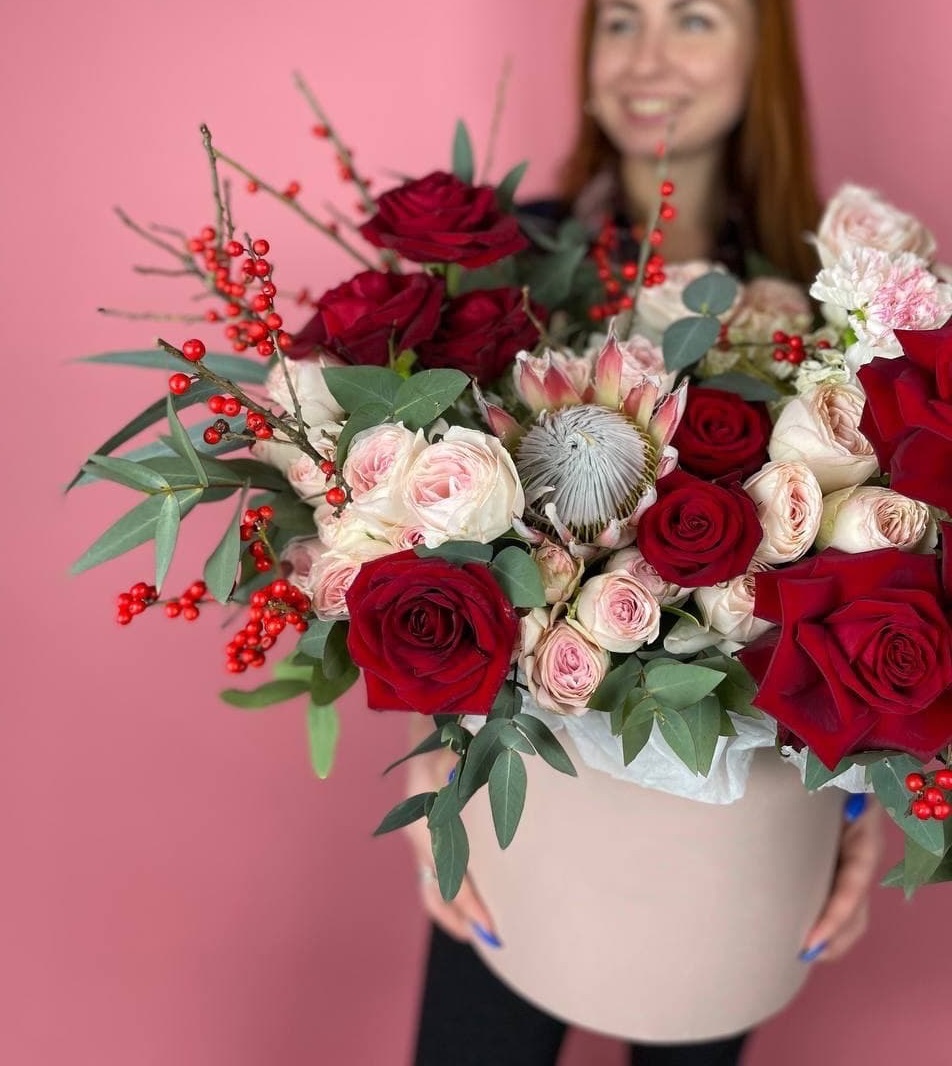Состав: пионовидные кустовые розы, диантусы, протея, илекс, декоративная зелень, тишью, бокс D25