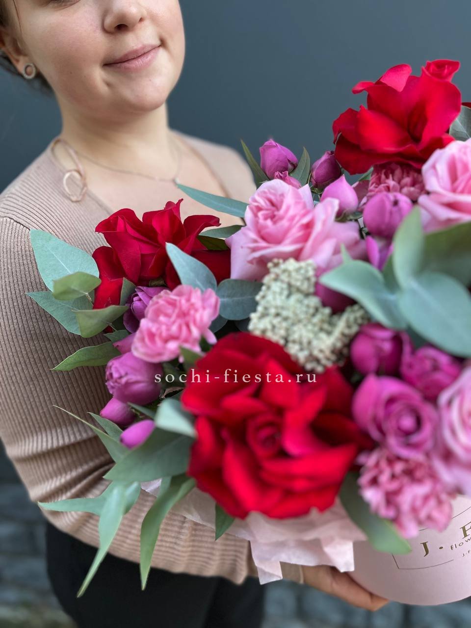 красная и розовая роза, озатамус, диантус, мисти баблс, эвкалипт, бокс 20.