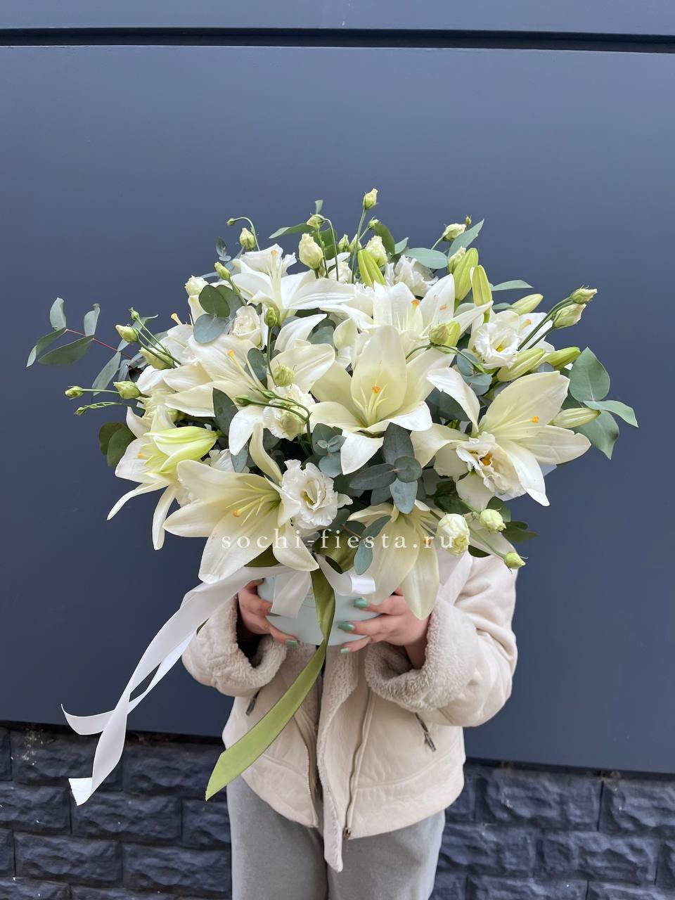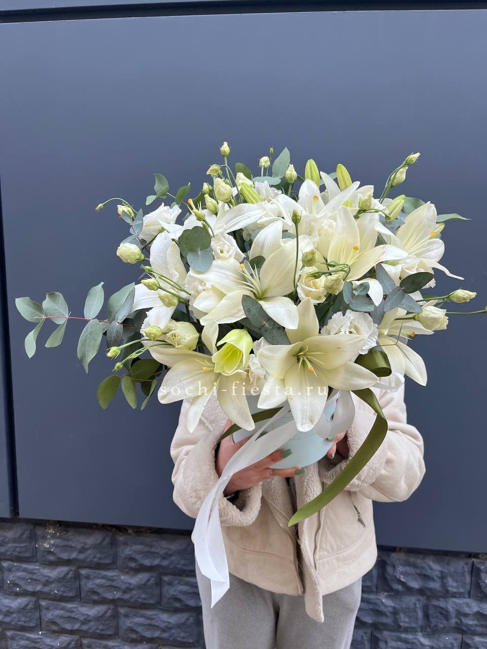 Для заказа товара "Бокс лилий и эустомы" с доставкой в Сириусе нажмите в корзину