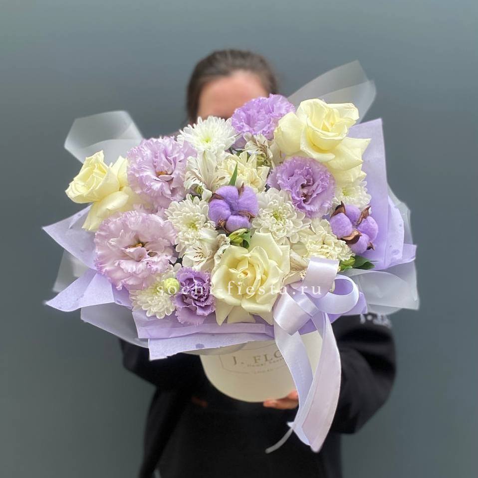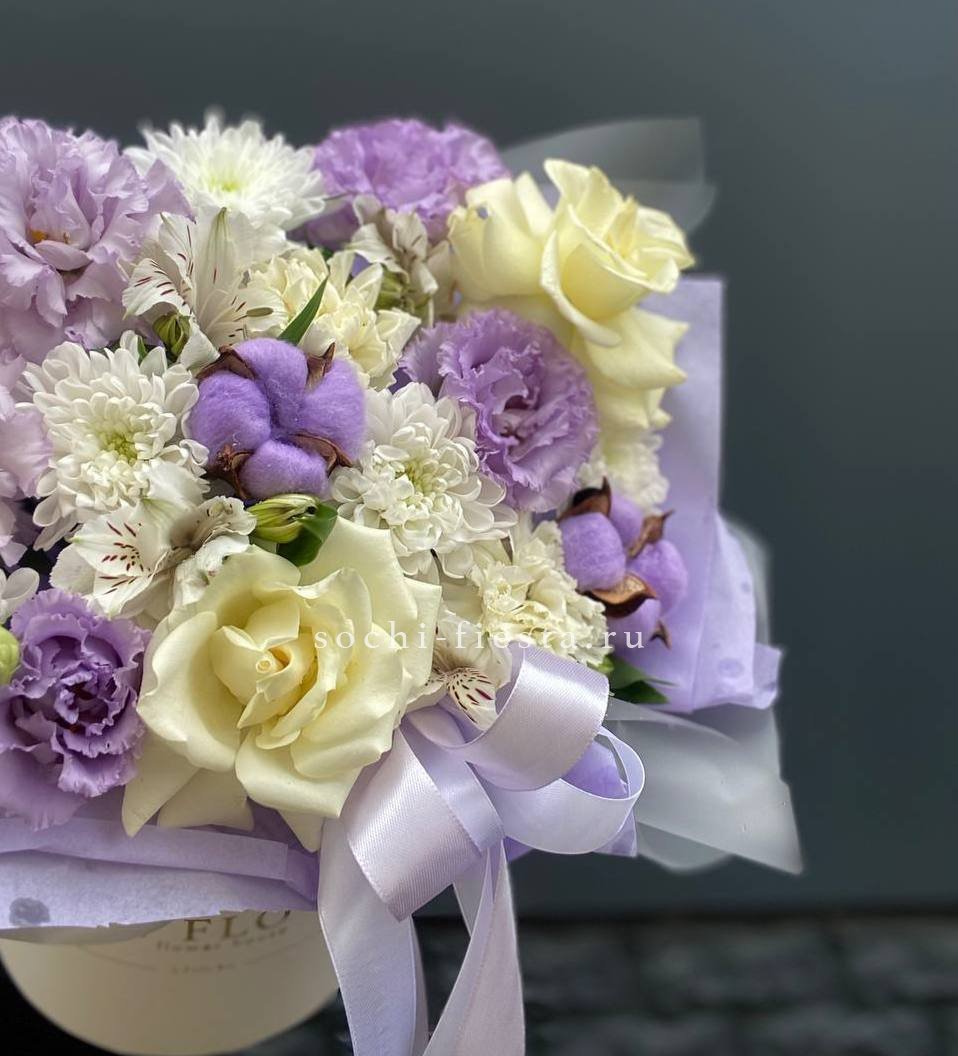 Авторский букет в составе которого: альстромерии, эустома, хризантемы, хлопок, диантусы, лента и дизайнерская пленка.
