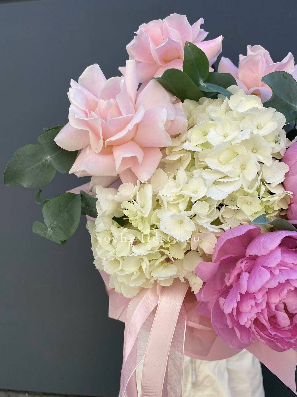 Пионы и гортензии наполняют композицию объемом и мягкой фактурой лепестков. Цилиндр собирает цветы в плотную форму, где каждый бутон находит свое место в общем движении.