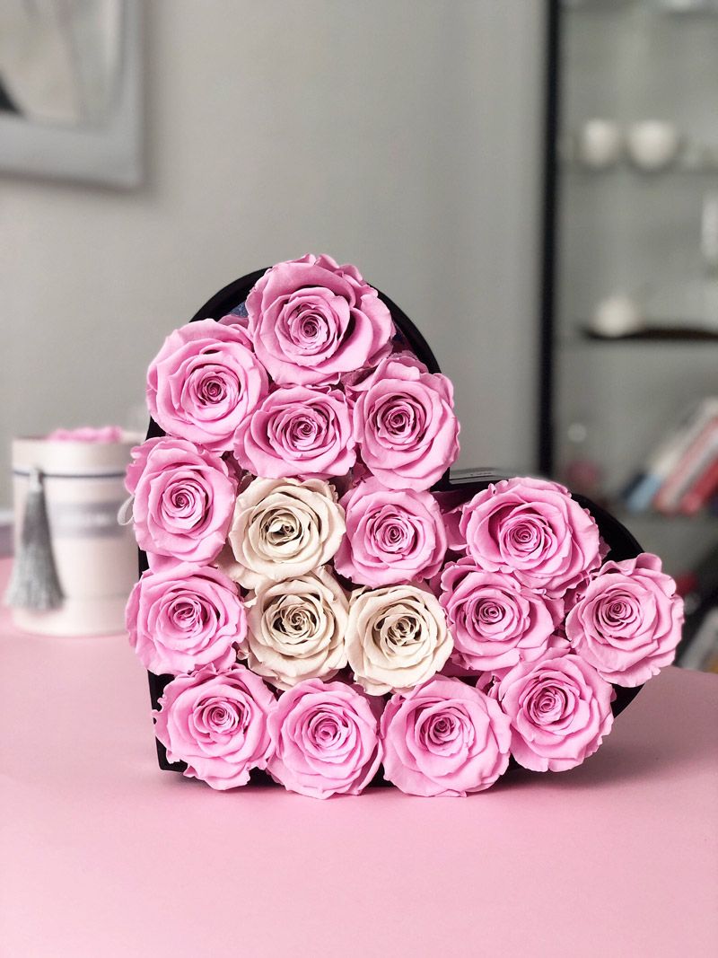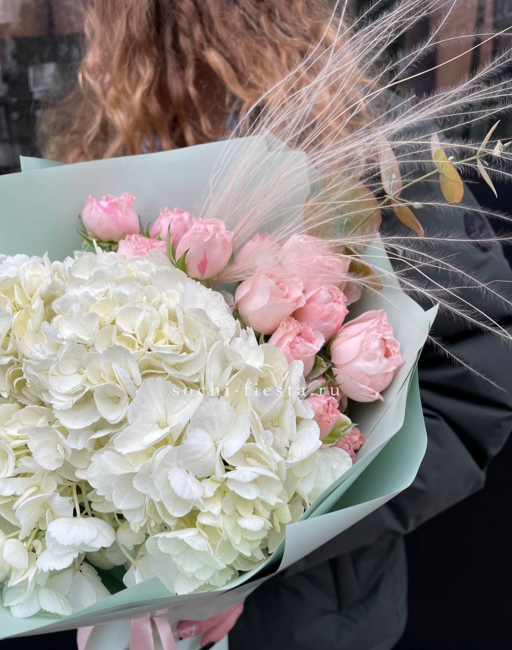 Состав: эустома 7шт, диантус 3шт, роза одноголовая 7шт, розы пионовидные бомбастик 6шт, гортензия, цилиндр D16, оазис 1шт, тишью