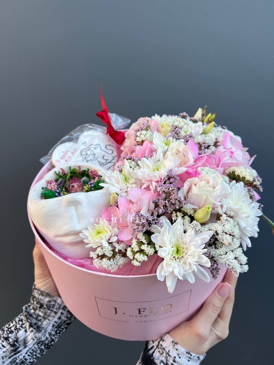 кокосовая свеча декоративная гипсовая, имбирный пряник, хризантемы, гортензия, статица (аналог), эустома, коробка.