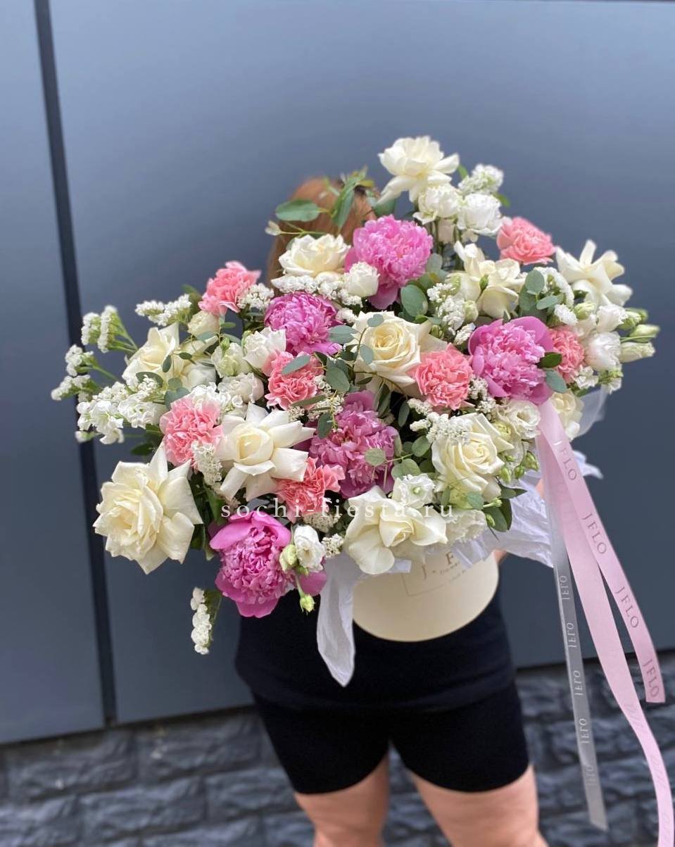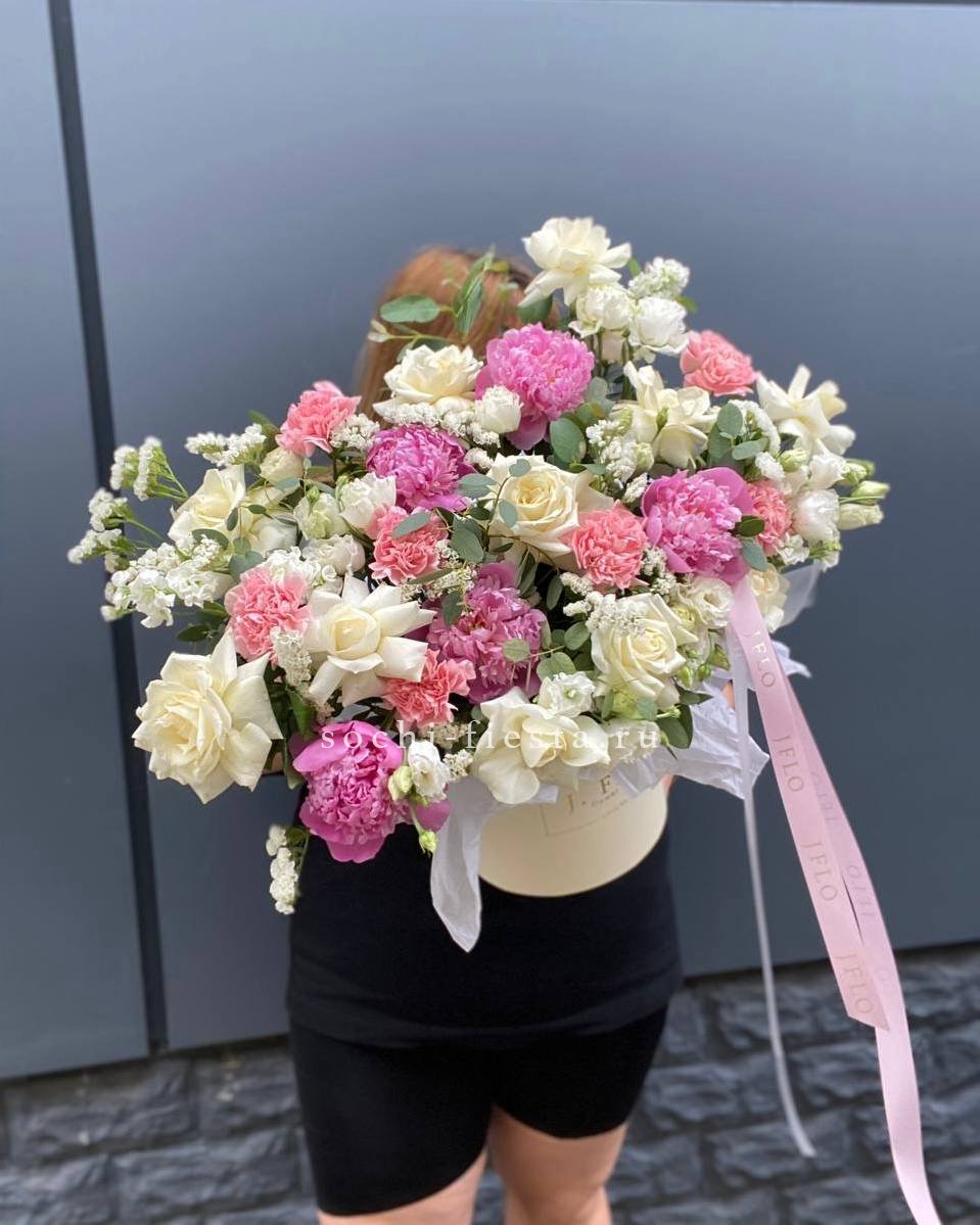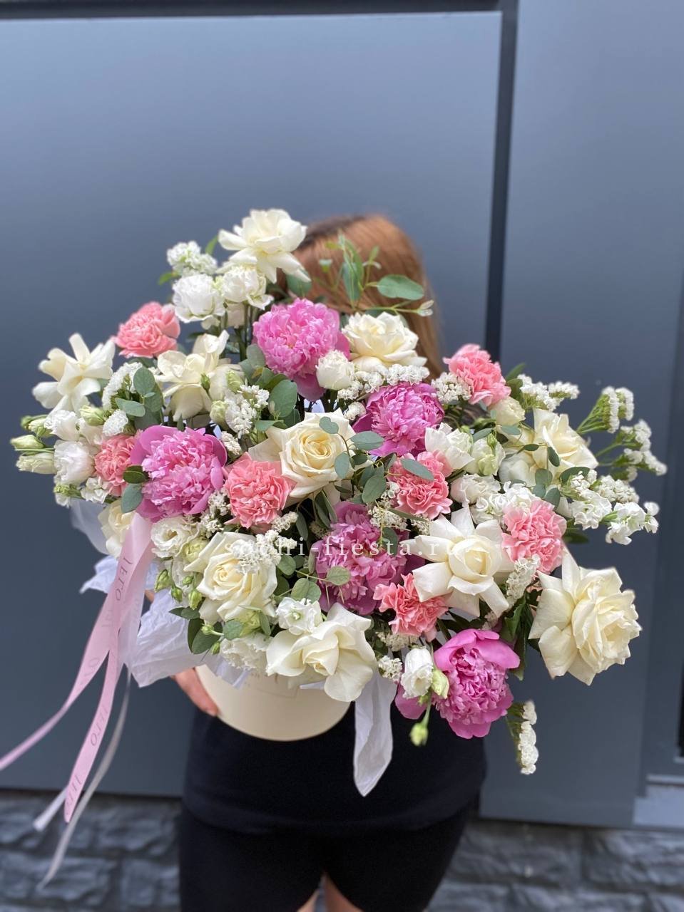 Состав: пионы (возможна замена, в зависимости от сезона), статица, эустома, диантус, маттиола, диантусы, цилиндр D20,  лента.