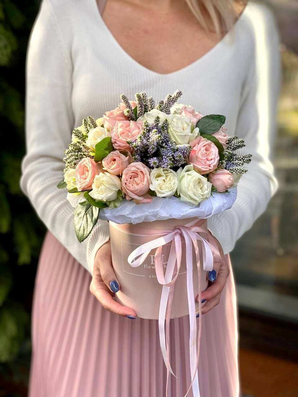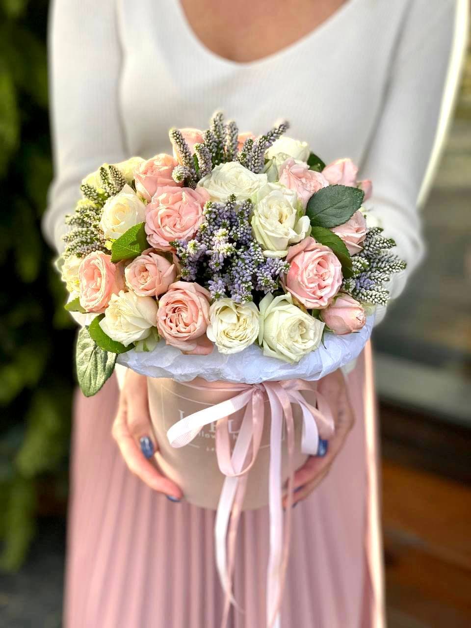 Кустовые розы собраны в плотную круглую форму и дополнены вертикальными стеблями вероники. Композиция в цилиндре выглядит графично и удерживает силуэт без дополнительных конструкций.