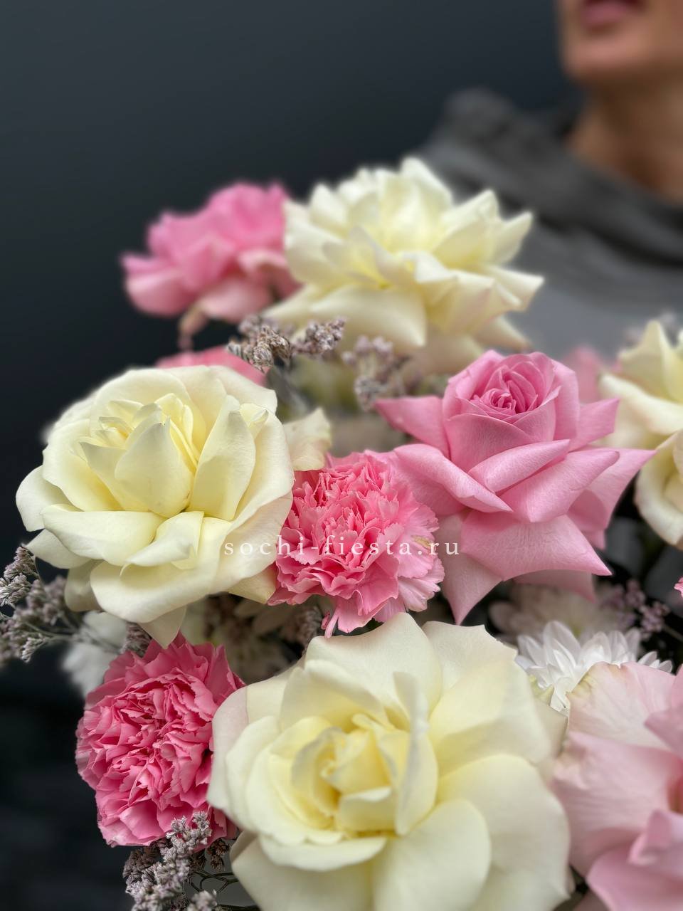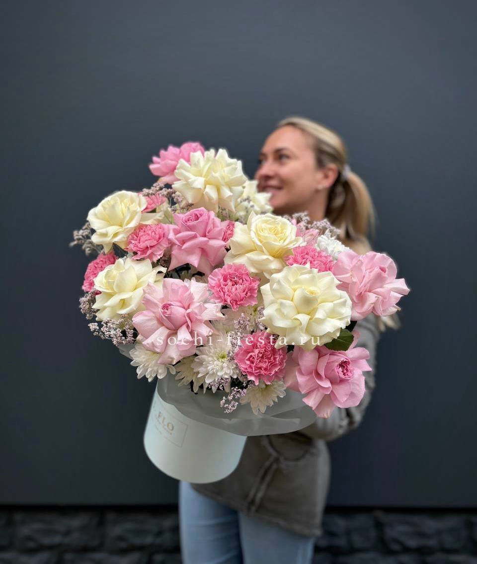 Для заказа товара "Коробка французских роз и диантусов "Бони"" с доставкой в Сириусе нажмите в корзину