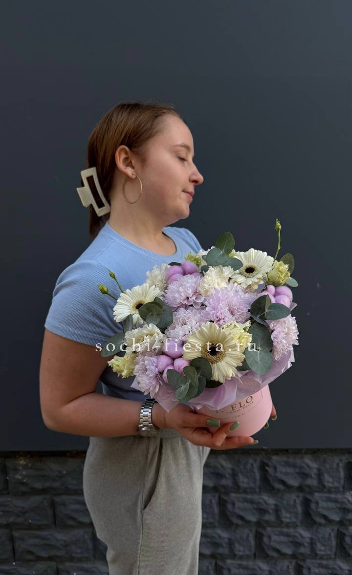 сборный нежный бокс из хризантемы, хлопка, герберы и эустомы.