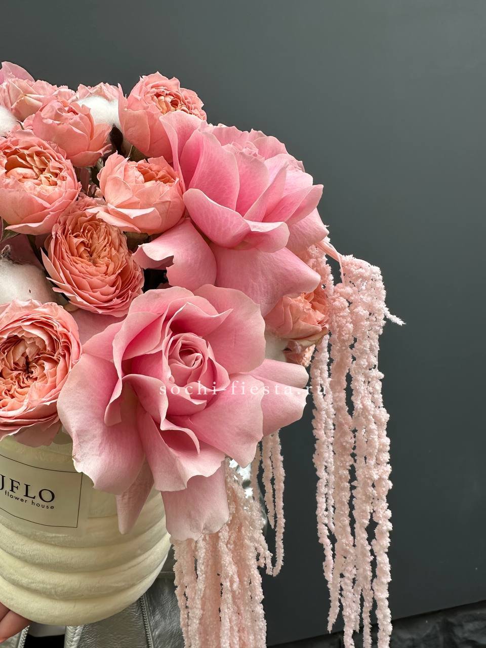 французские розы, кустовые розы джульетта, хлопок,  амарантус, зефирный цилиндр D13, эвкалипт, лента, упаковка.