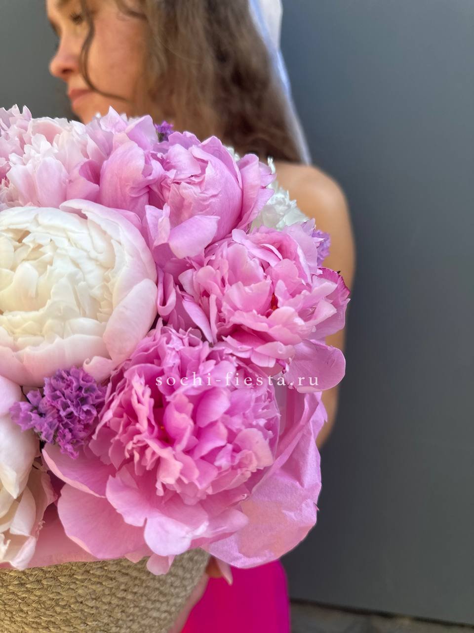 15 пионов в джутовом кашпо
