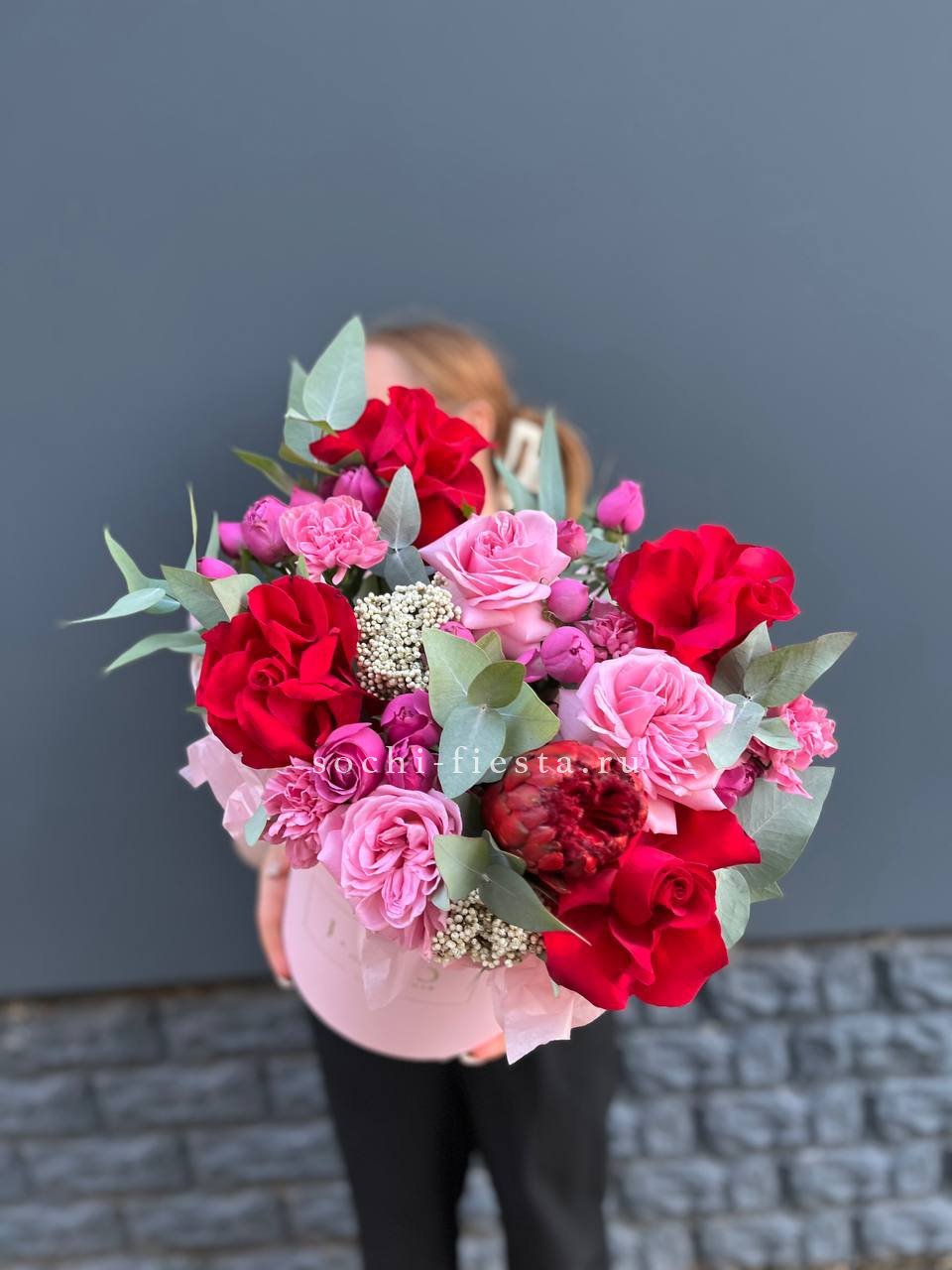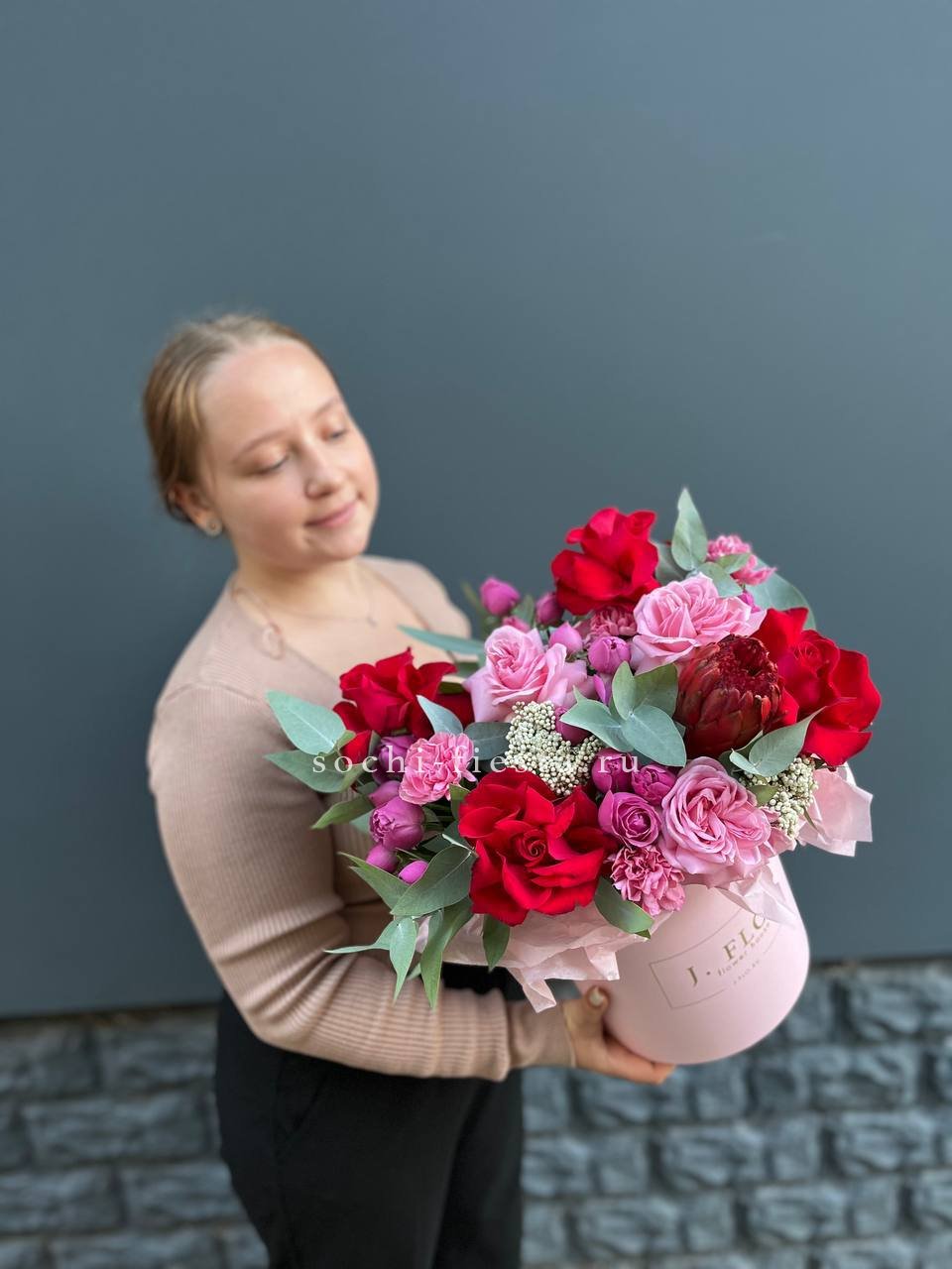 Эта роскошная композиция в модной сумочке объединяет благородные цветы с разными текстурами, создавая многогранный и богатый образ. Деликатные оттенки символизируют утонченность, элегантность и безупречный вкус. Сумочка подчеркнет индивидуальность дарителя и станет незабываемым акцентом любого торжества.