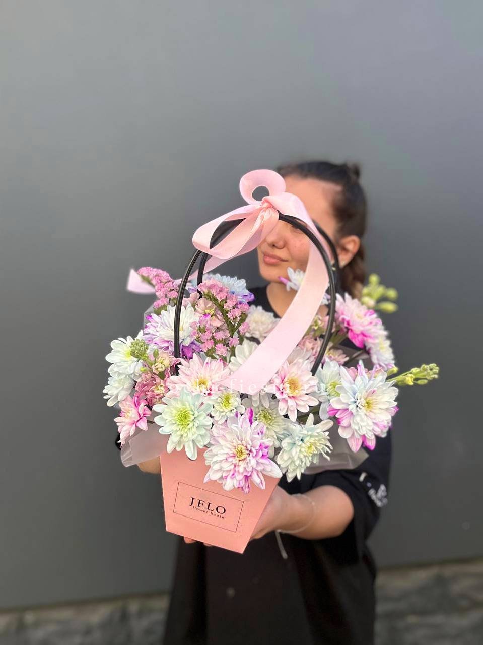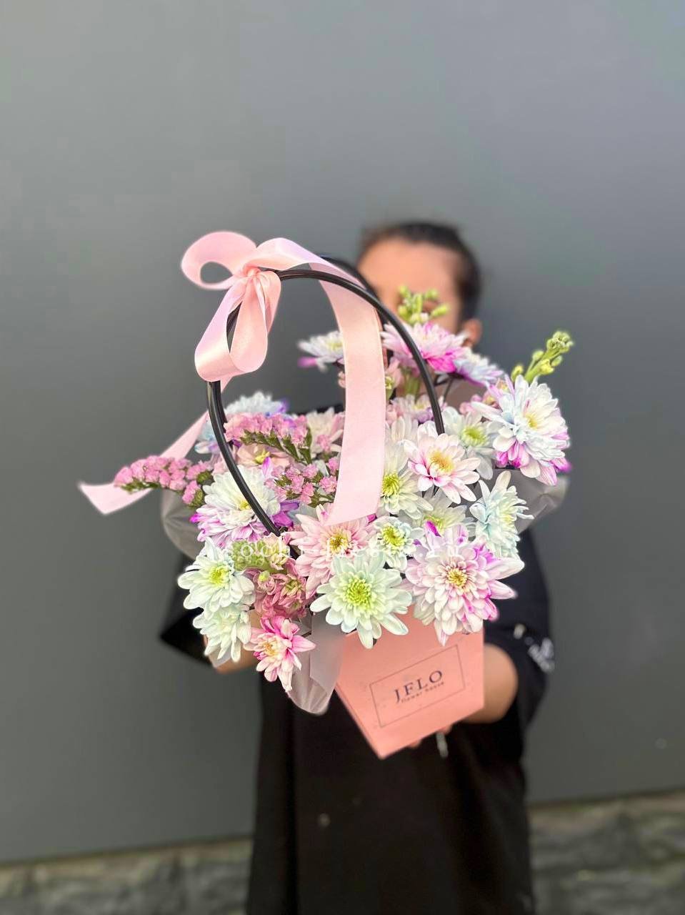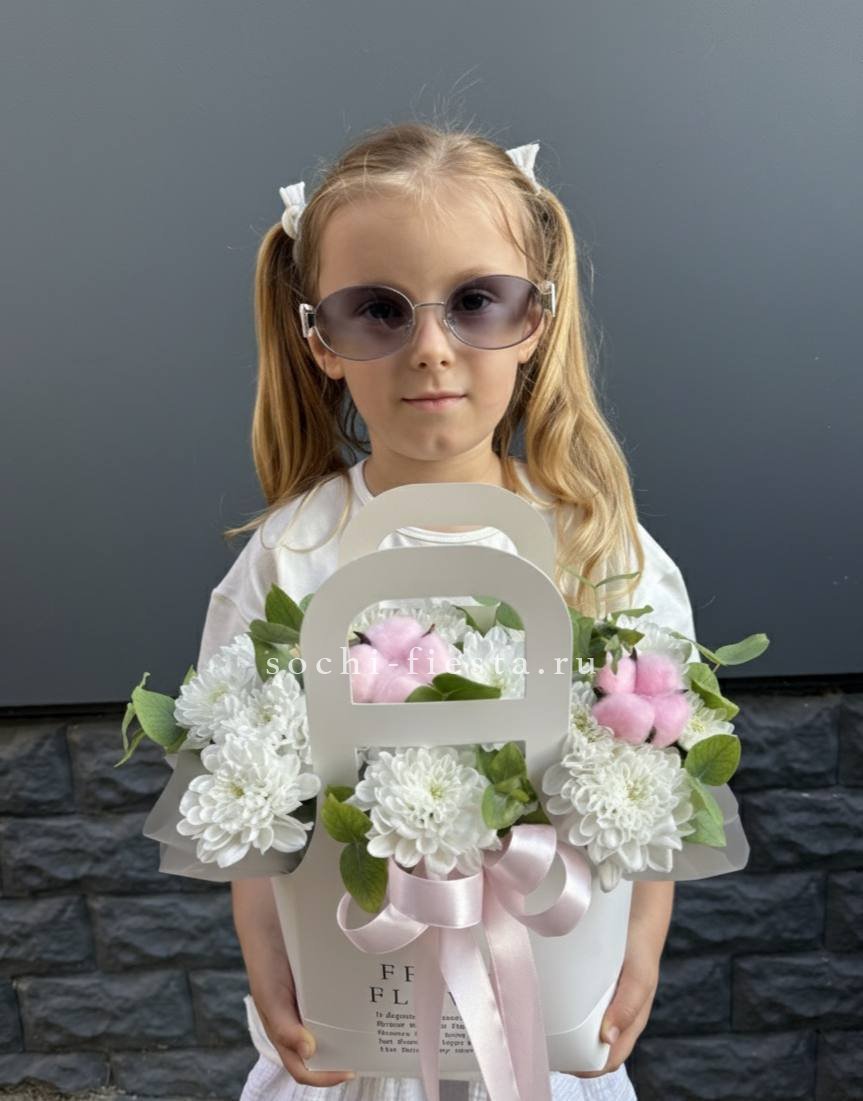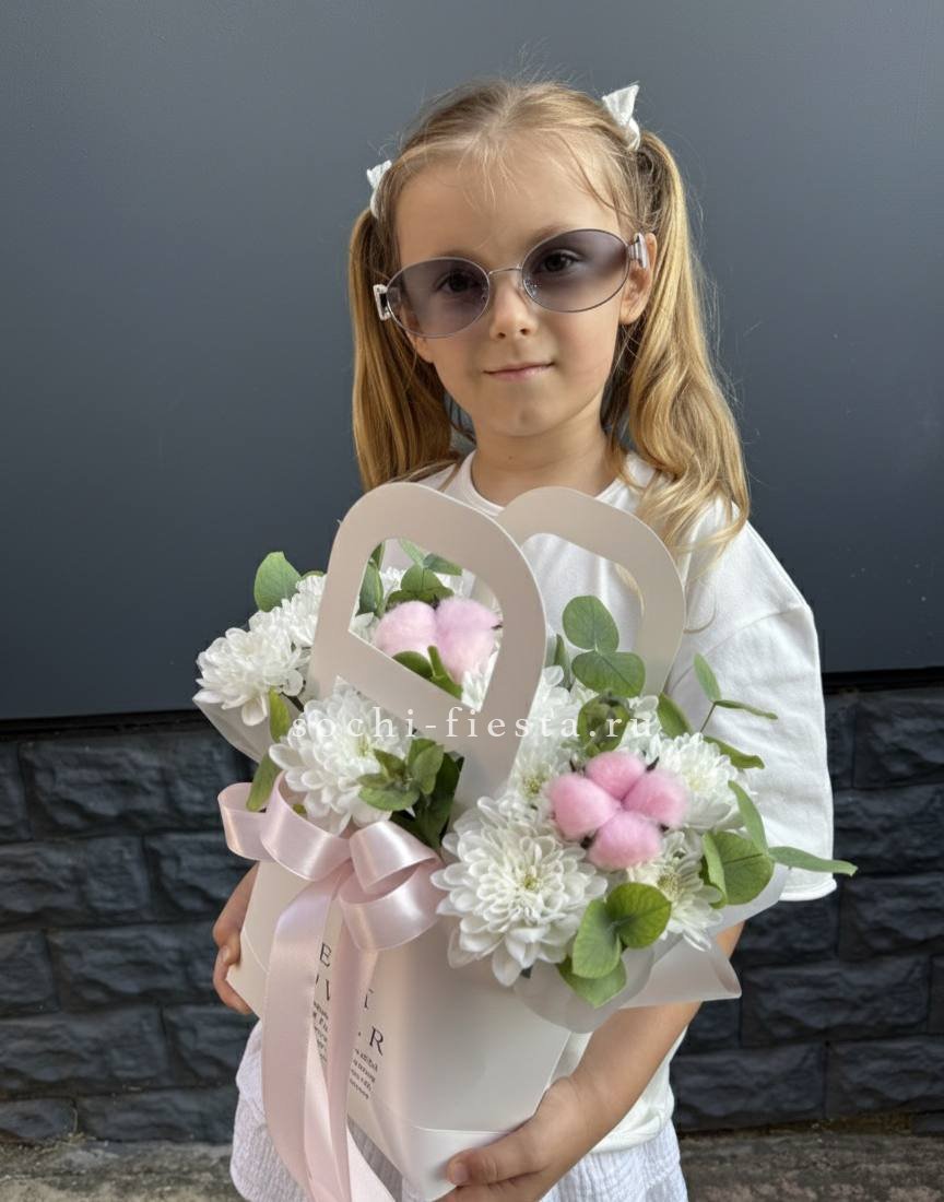 Эустома и кустовые хризантемы в сумке-кашпо образуют пышную многослойную композицию. Плотные бутоны и открытые цветки создают живую фактуру и объем.