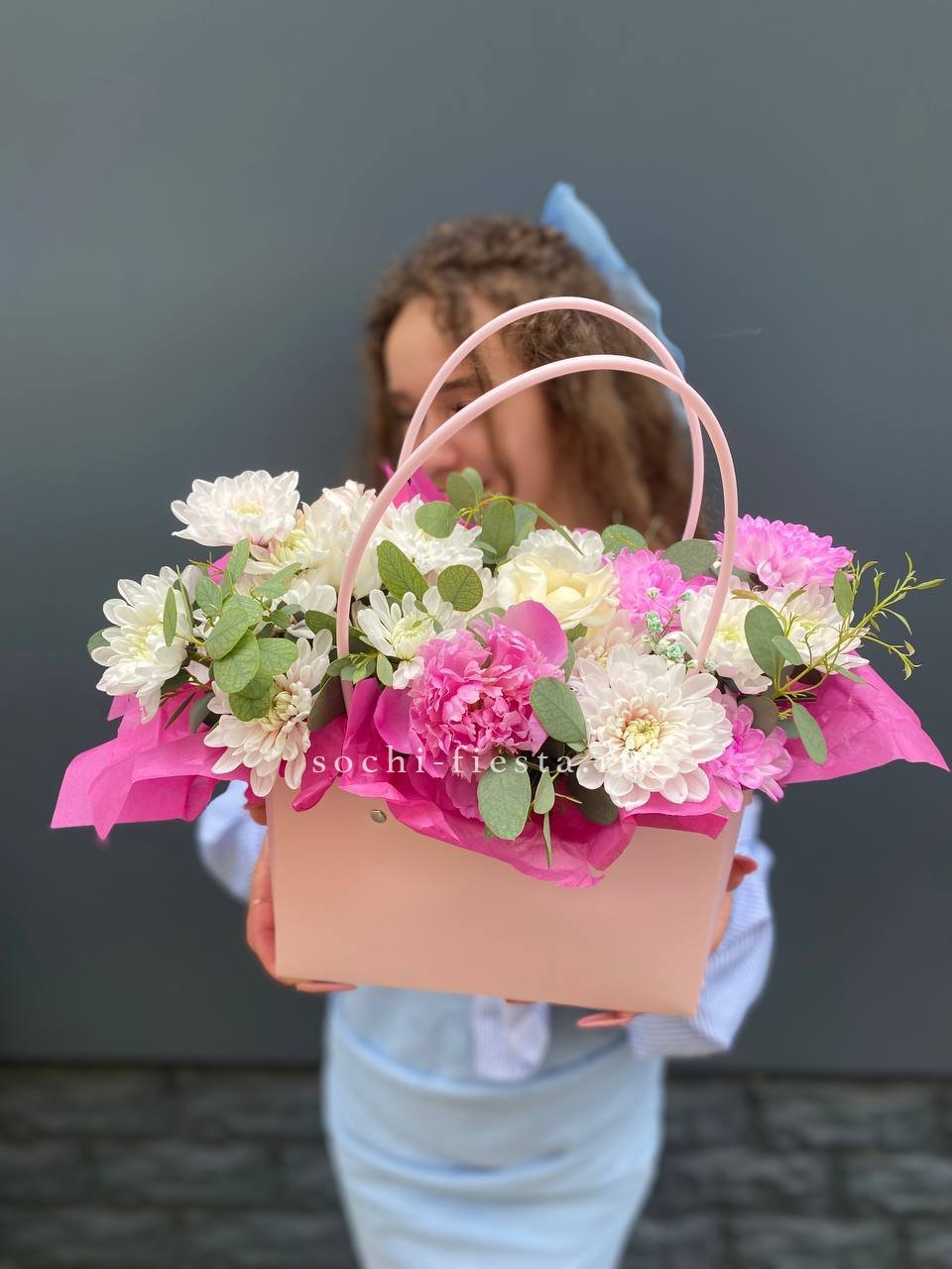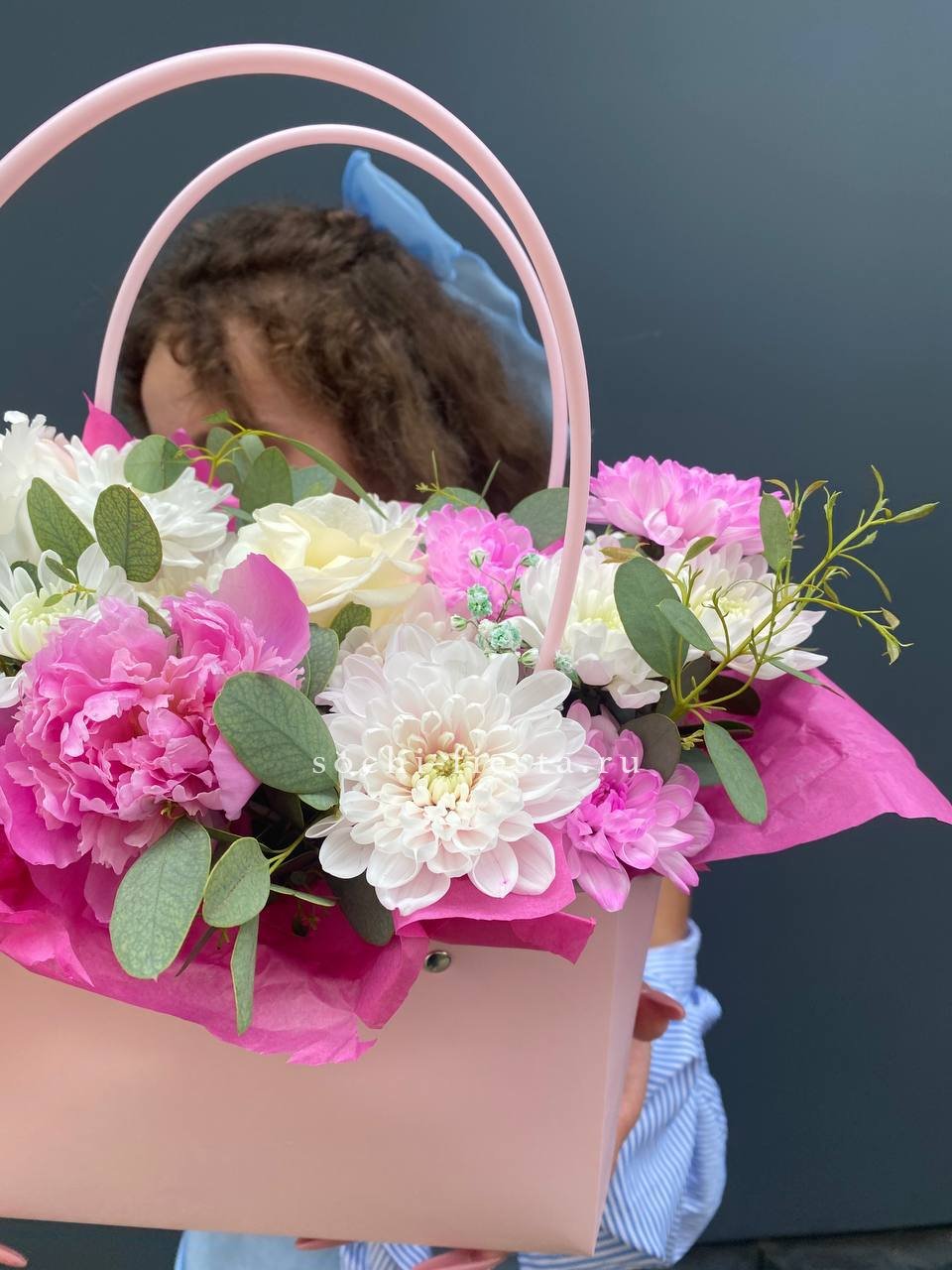 Пионы и хризантемы уложены в сумку-кашпо с лентой. Округлые головки пионов задают ритм, хризантемы поддерживают объем. Композиция выглядит собранно и свежо.