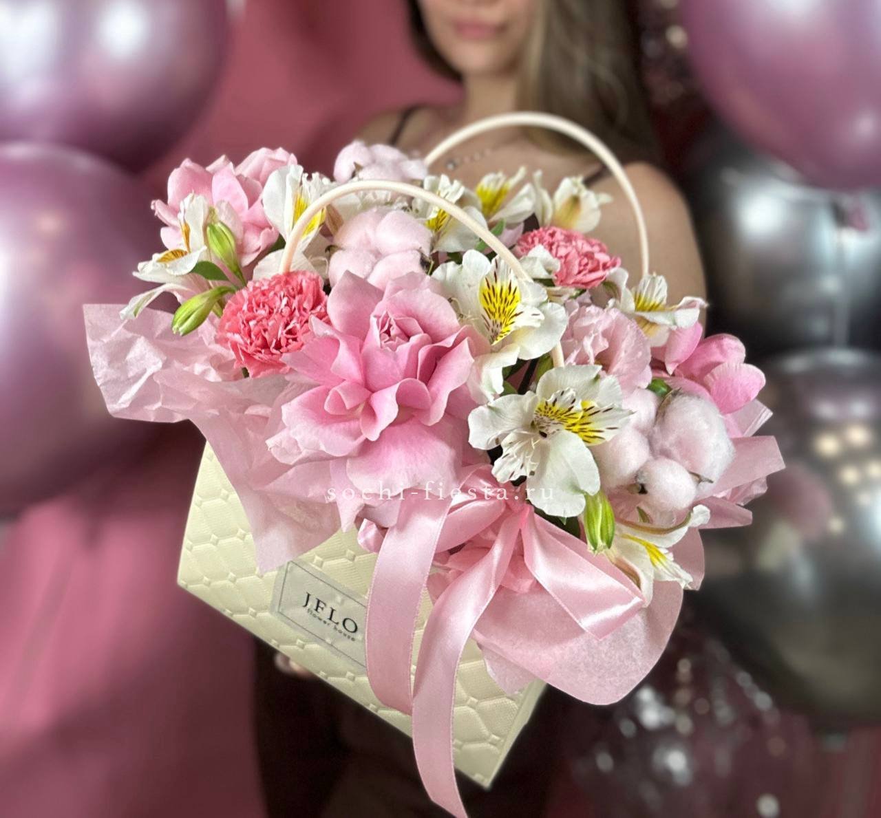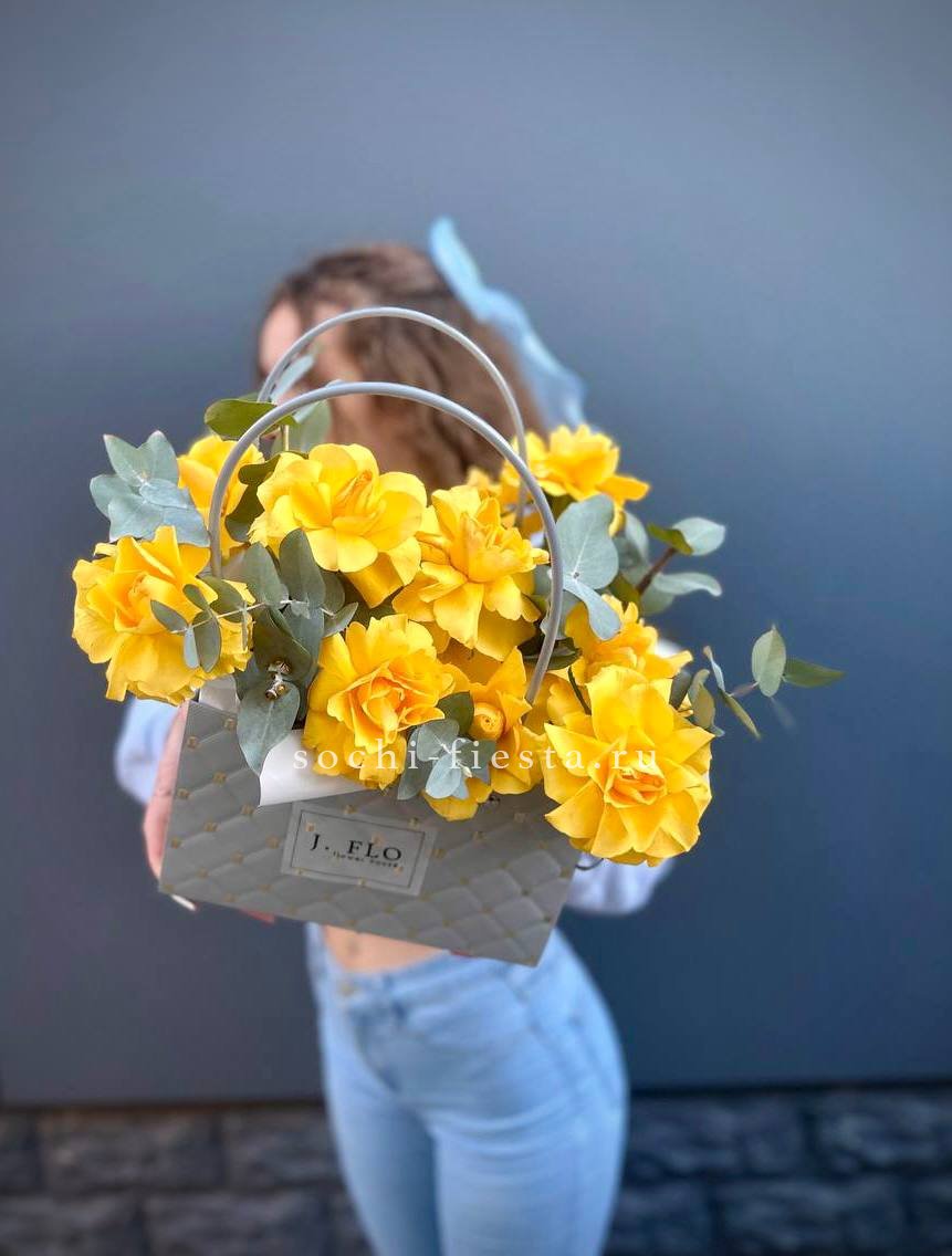 Классическая сумочка с розами в лаконичном исполнении. Эвкалипт обрамляет бутоны серебристой зеленью. Компактная форма подходит для любого интерьера и события.