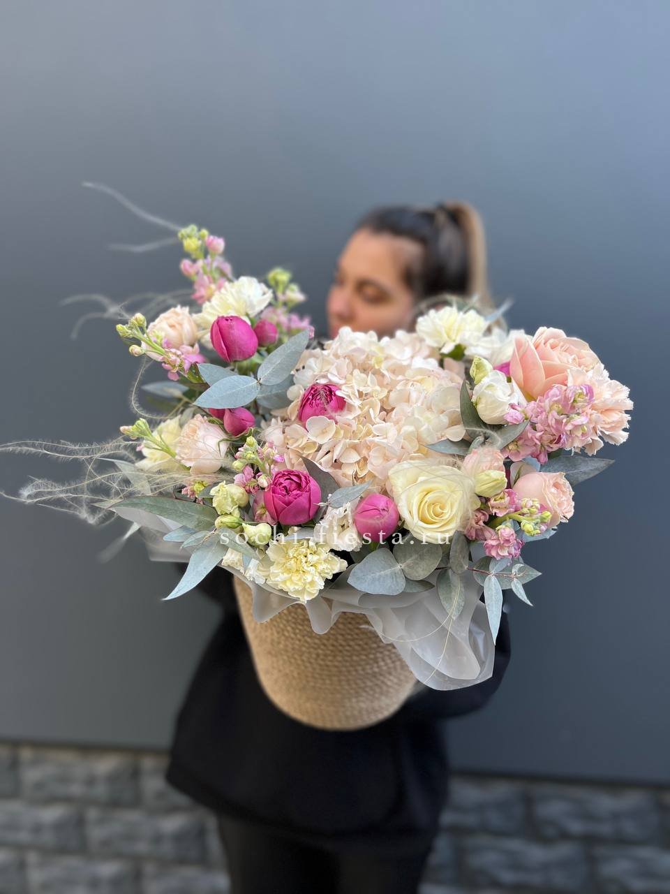 розы, эвкалипт, лента, сумка-кашпо.