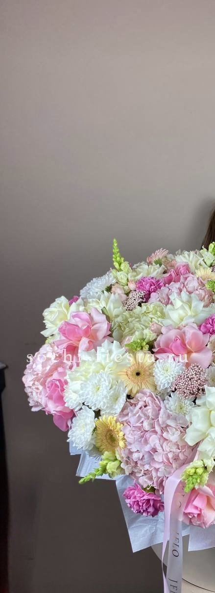 Состав: коробка с цветами разноцветного градиента (гортензии, розы, герберы, диантусы, кустовые розы, альстромерии, хризантемы, антирринум, озотамус)